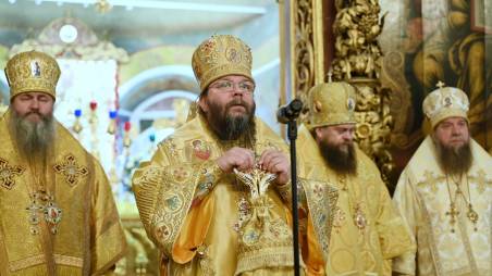 Его Высокопреосвященству сослужили: архимандрит Марк (Быстриков), иерей Роман Гизитдинов, иеромонах Анастасий (Байков), иерей Андрей Кичайкин. Песнопения Литургии исполнил хор воскресной школы Свято-Успенского Псково-Печерского монастыря под управлением Екатерины Жаковой. За богослужением молились учащиеся воскресной школы и их родители, прихожане храма и паломники. По запричастном стихе митрополит Тихон обратился ко всем собравшимся…