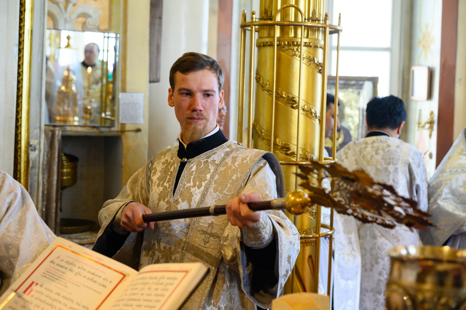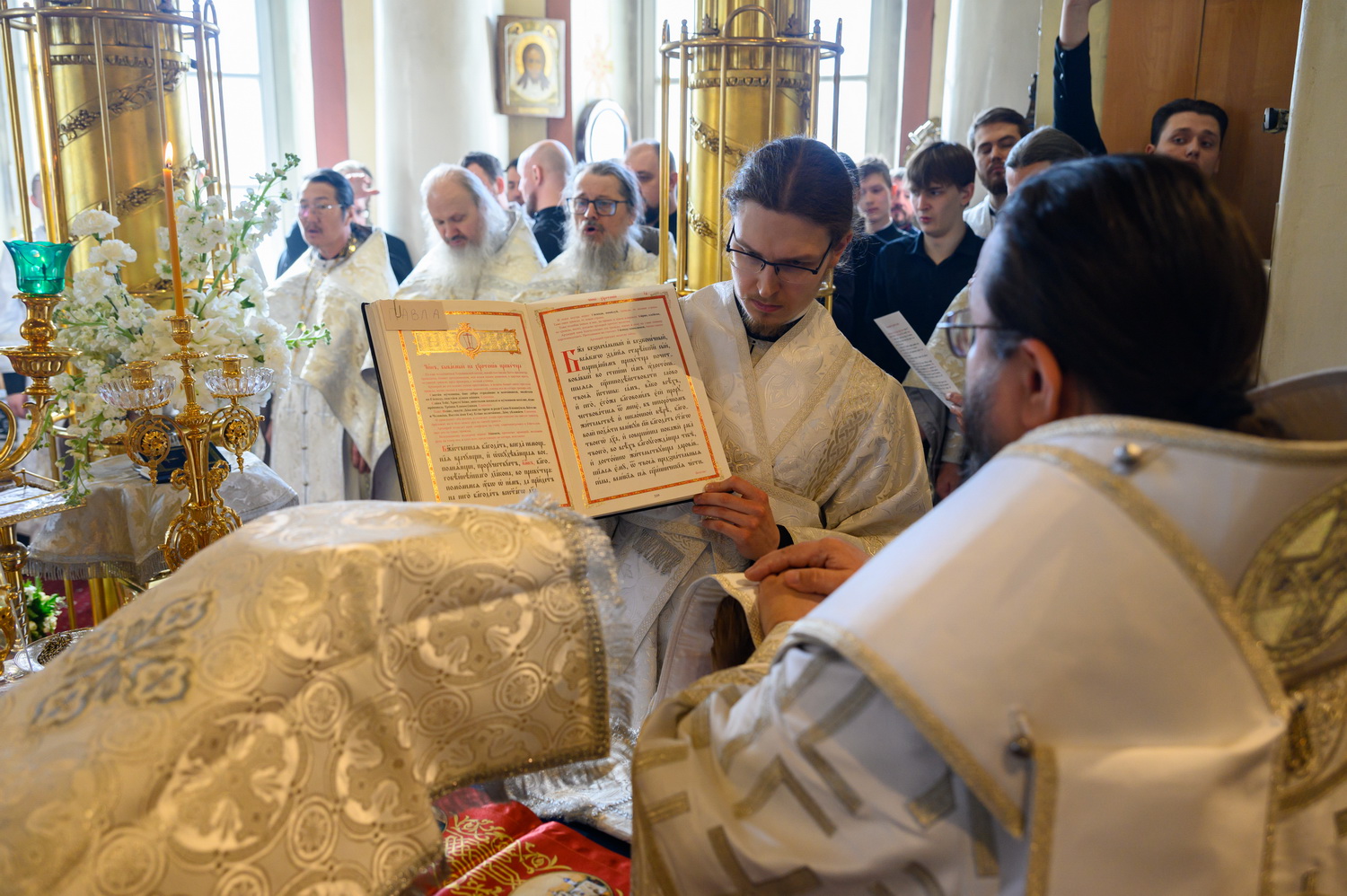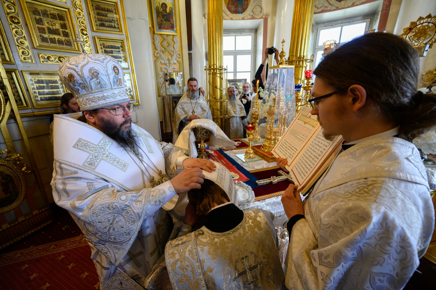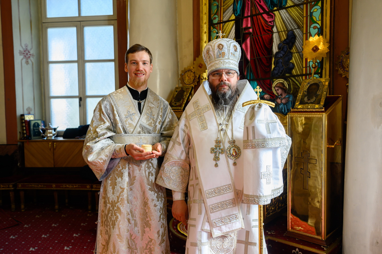 За Литургией митрополит Матфей рукоположил выпускника Псково-Печерской духовной семинарии Тихона Козьякова в сан диакона и клирика Свято-Успенского Псково-Печерского монастыря диакона Павла Киреева в сан пресвитера.