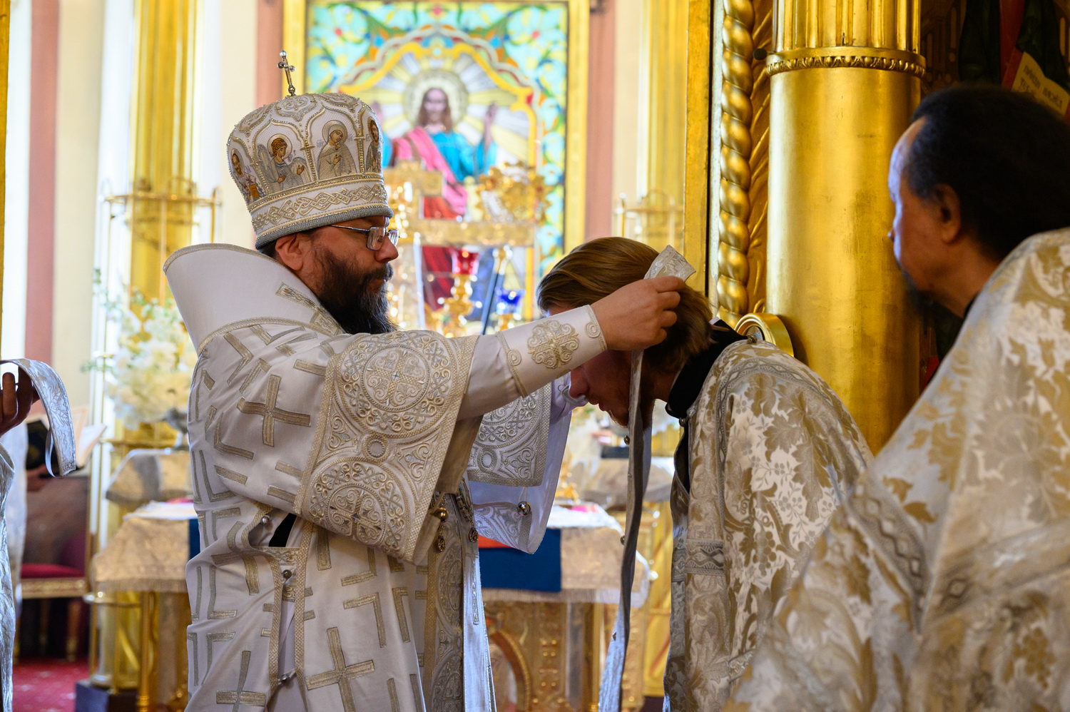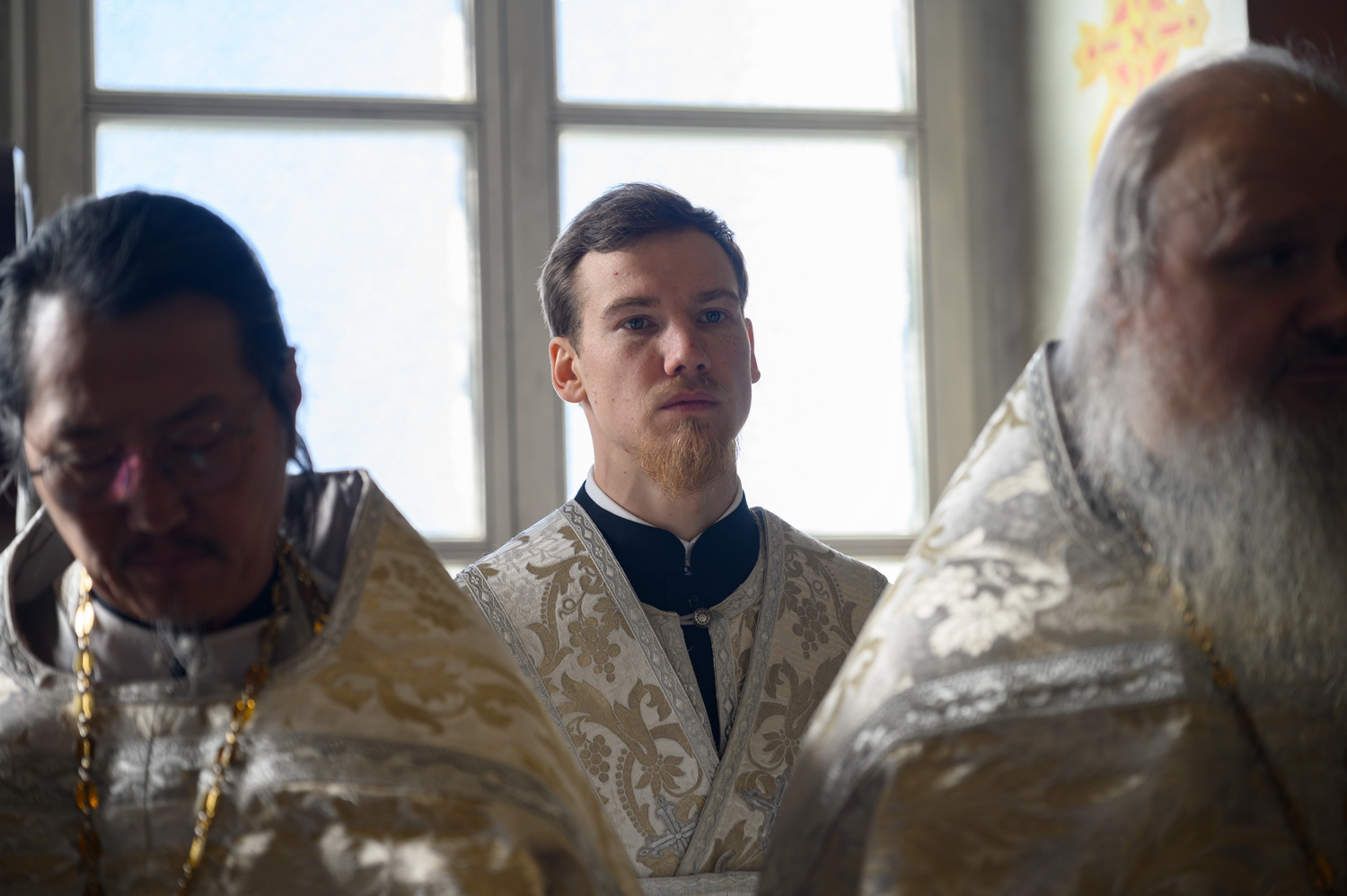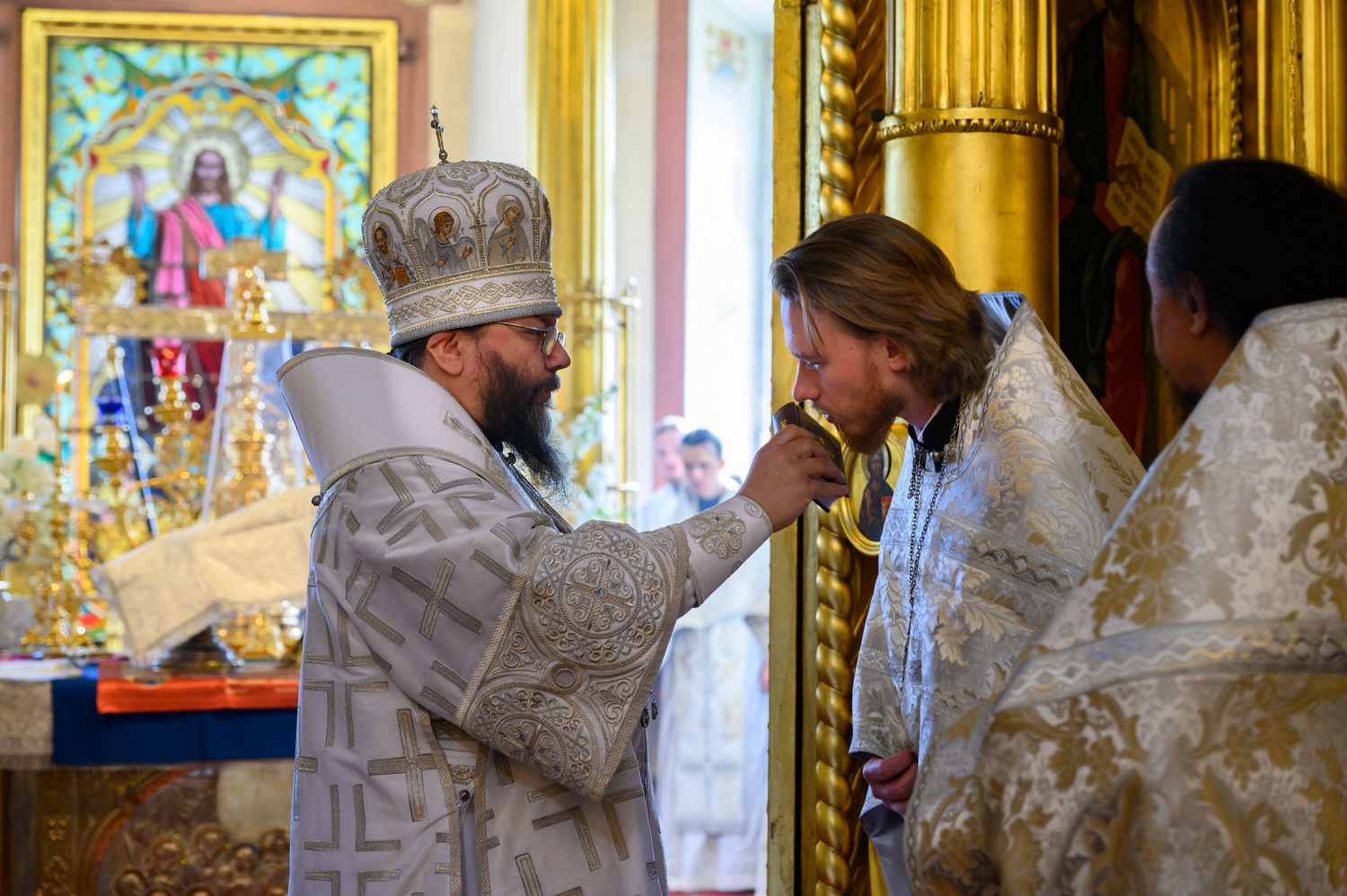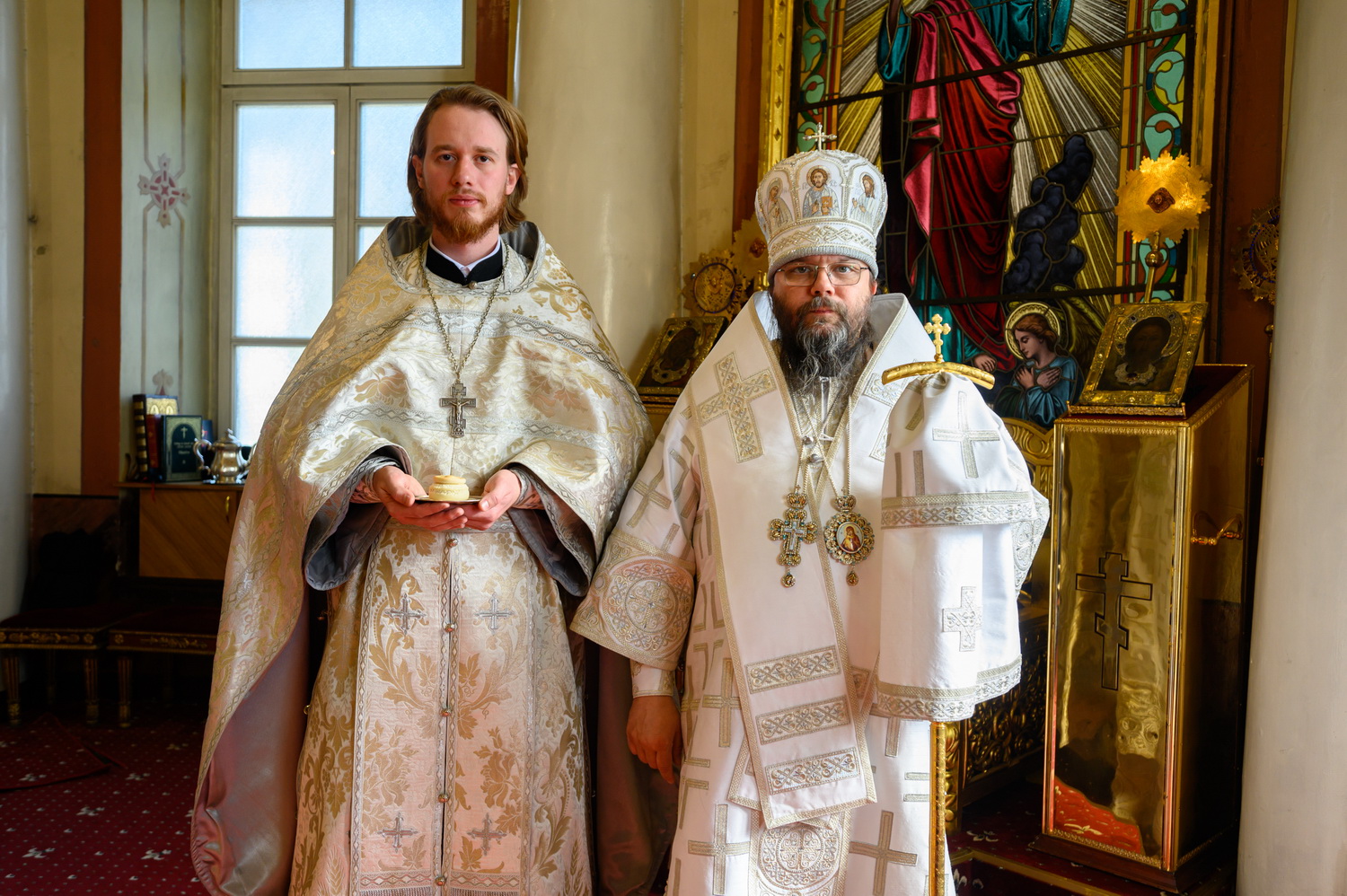 За Литургией митрополит Матфей рукоположил выпускника Псково-Печерской духовной семинарии Тихона Козьякова в сан диакона и клирика Свято-Успенского Псково-Печерского монастыря диакона Павла Киреева в сан пресвитера.