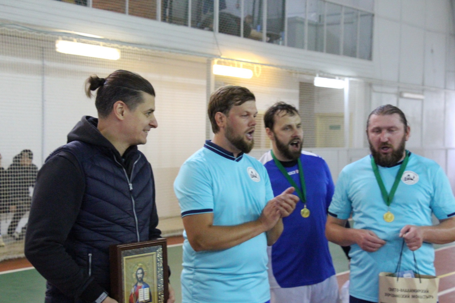 В память об этом событии наши батюшки вручили Владимиру Анатольевичу образ Господа Вседержителя, а всем игрокам команды-соперника образочки Святой Троицы и книжечки о Псково-Печерских старцах.