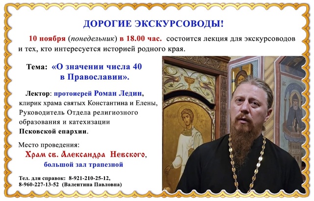 10 ноября 2025 года в 18:00 в большом зале трапезной храма святого благоверного великого князя Александра Невского города Пскова состоится лекция для экскурсоводов и тех, кто интересуется историей родного края на тему: «О значении числа 40 в Православии».