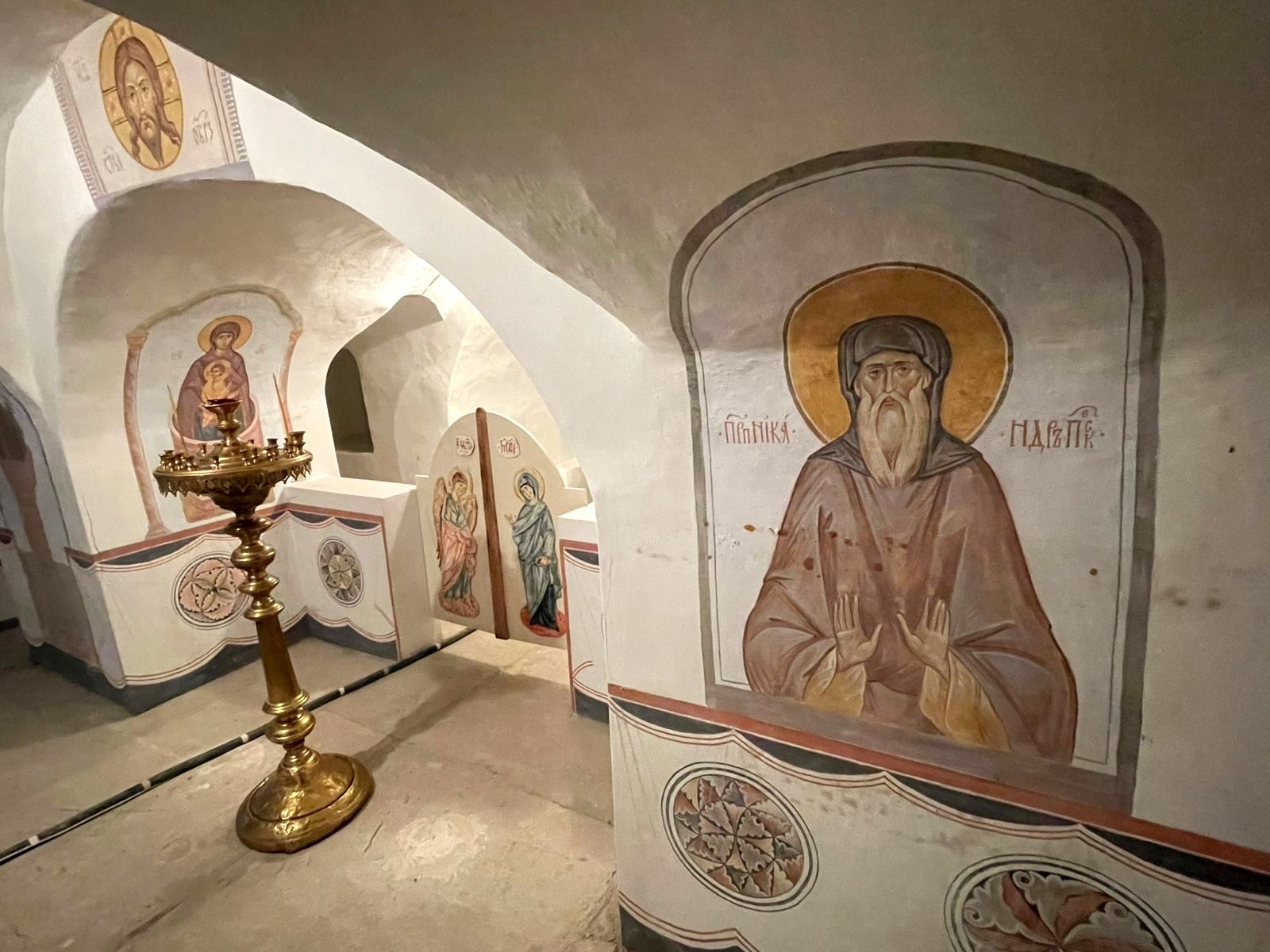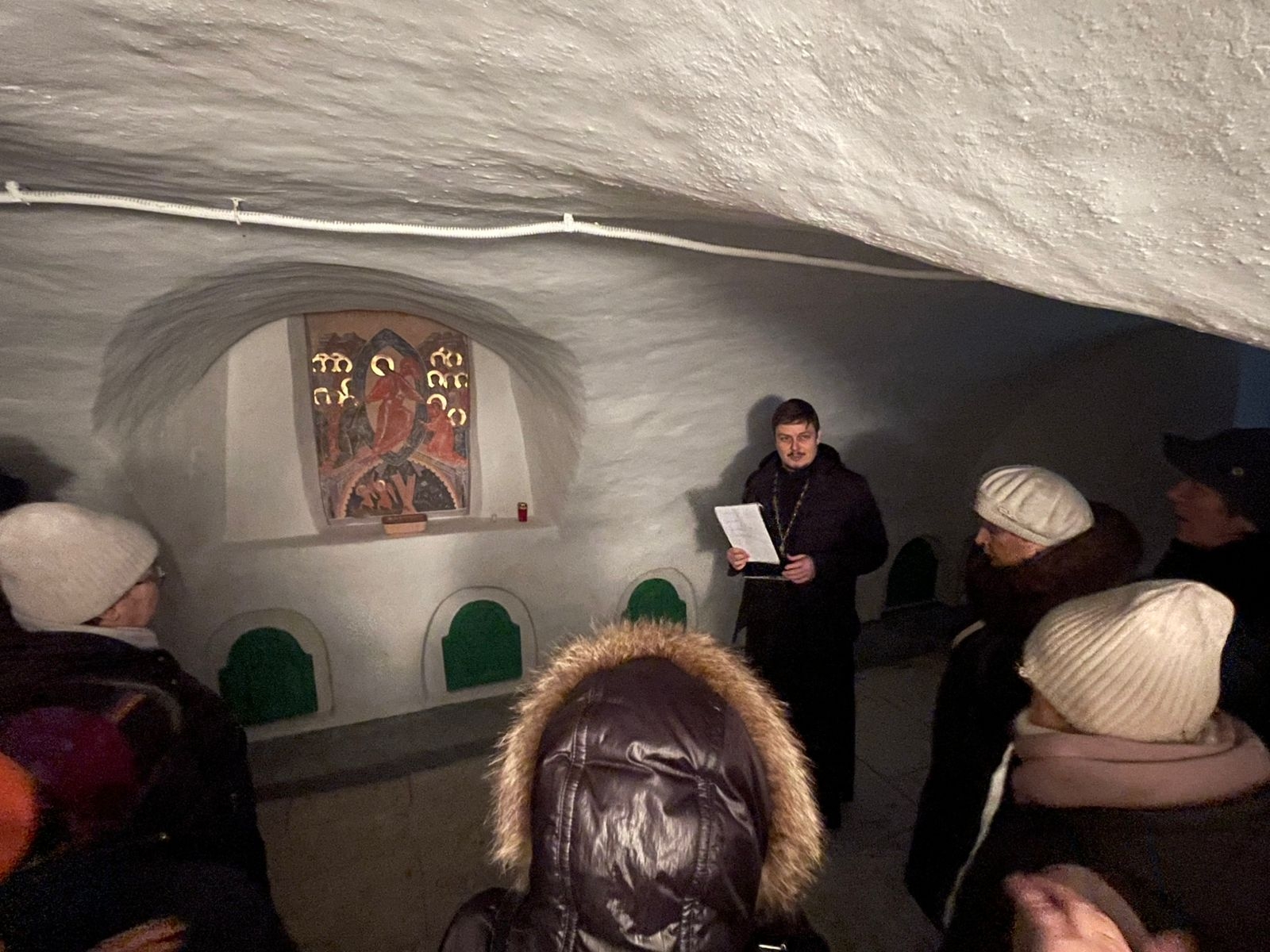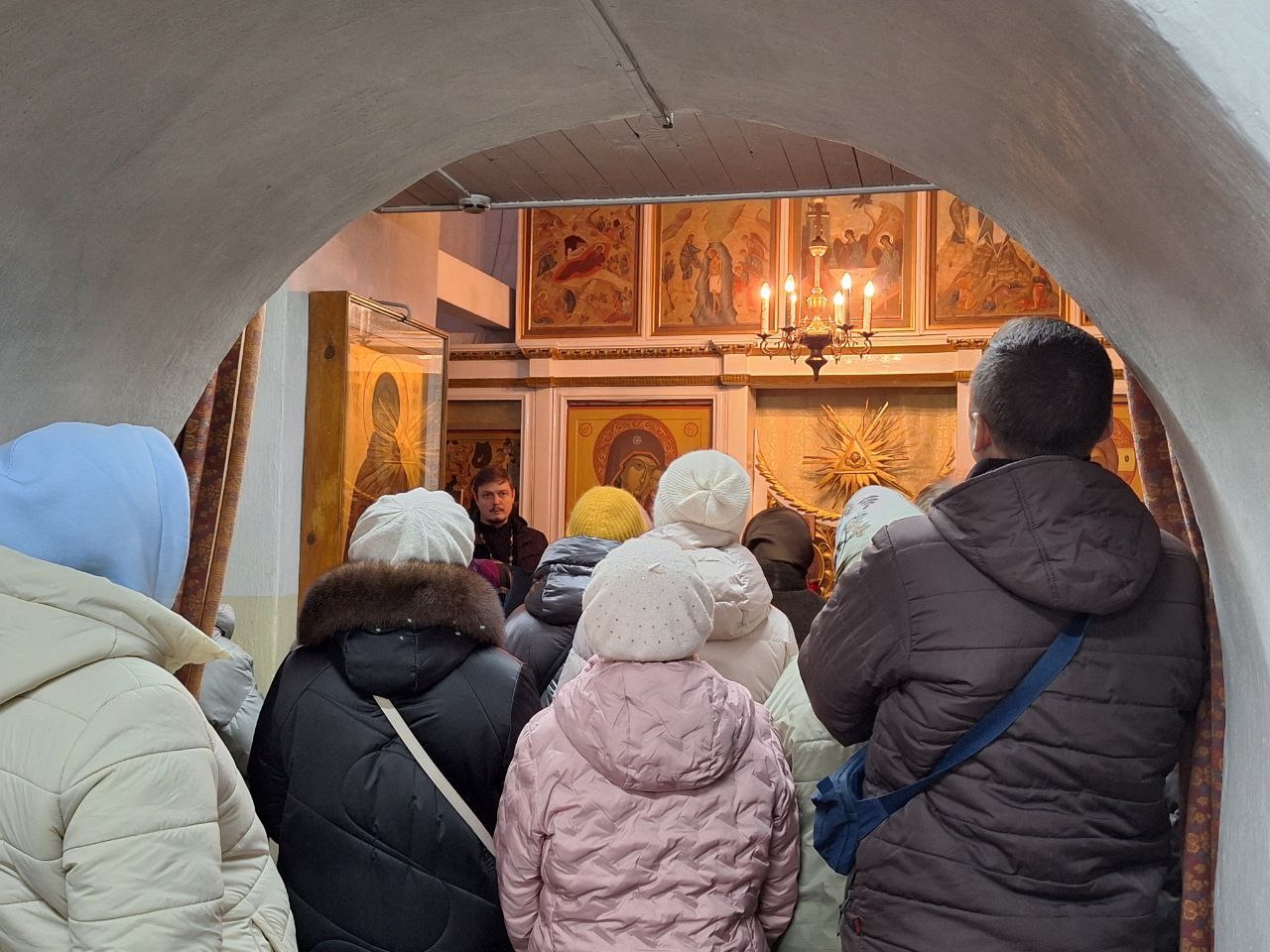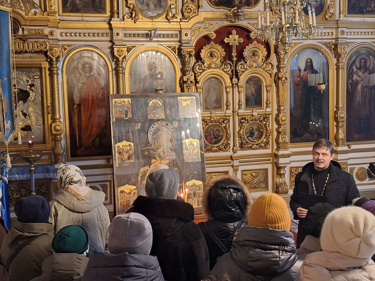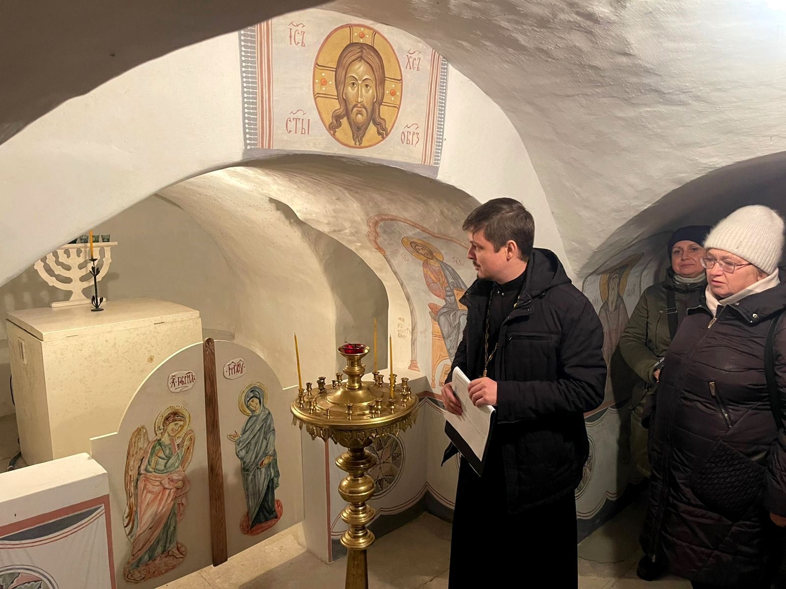 В храме экскурсоводов встретил настоятель иерей Павел Орлов. Батюшка подробно рассказал об истории храма, о чудотворной Любятовской иконе Божией Матери. Вместе с отцом Павлом экскурсоводы посетили нижний храм преподобного Никандра Псковского, где большинство присутствующих было впервые.
