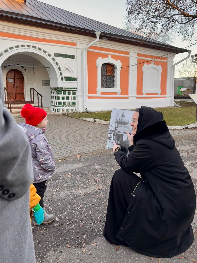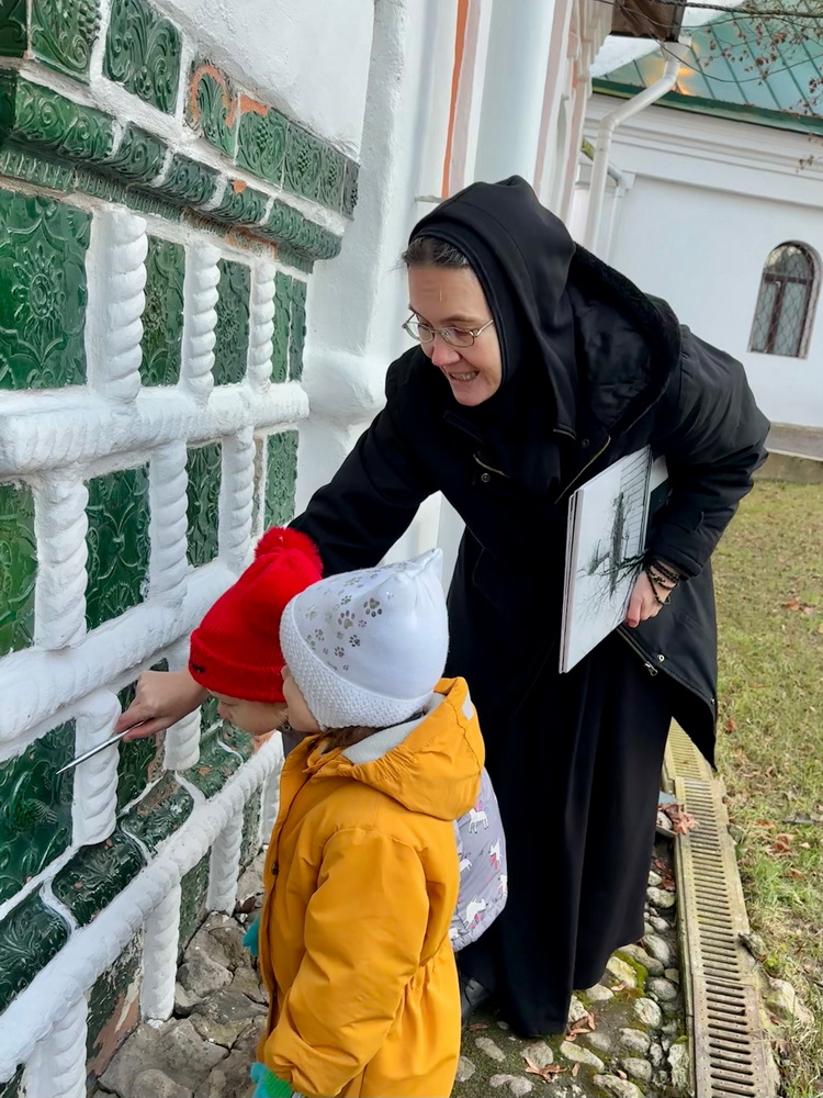 По благословению настоятельницы обители игумении Рафаилы, маленьких гостей у монастырских ворот встретила монахиня Валерия. С вниманием и заботой она провела экскурсию, раскрывая детям красоту монастырской жизни, напоминая, что каждый здесь — под Покровом Богородицы; каждый, кто входит в дом Пресвятой Девы, становится видим для Неё.
