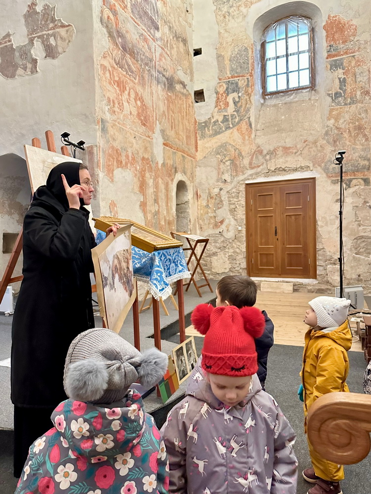 В древнем соборе Рождества Богородицы сестра Валерия, обладая глубокими знаниями в области церковного искусства и истории, в доступной и увлекательной форме рассказала детям об уникальных фресках, на которых первые псковские иконописцы отобразили страницы Евангелия. Она детально осветила особенности монастырской жизни, специфику фресковых росписей и иконописных традиций, подчеркнув различия между иконой и фреской, как художественными и духовными феноменами.
