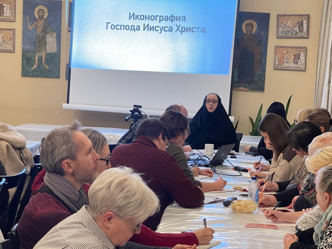 Беседу с экскурсоводами и теми, кто интересуется историей родного края, провела монахиня Михаила (Писарева), старшая сестра иконописной мастерской Рождества Богородицы Снетогорского монастыря.