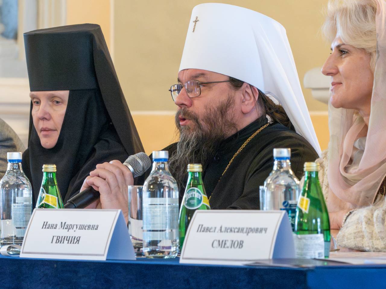 От духовных учебных заведений в работе круглого стола приняли участие: ректор Санкт-Петербургской Духовной Академии епископ Петергофский Силуан и представитель Учебного комитета Русской Православной Церкви иерей Димитрий Каширин.