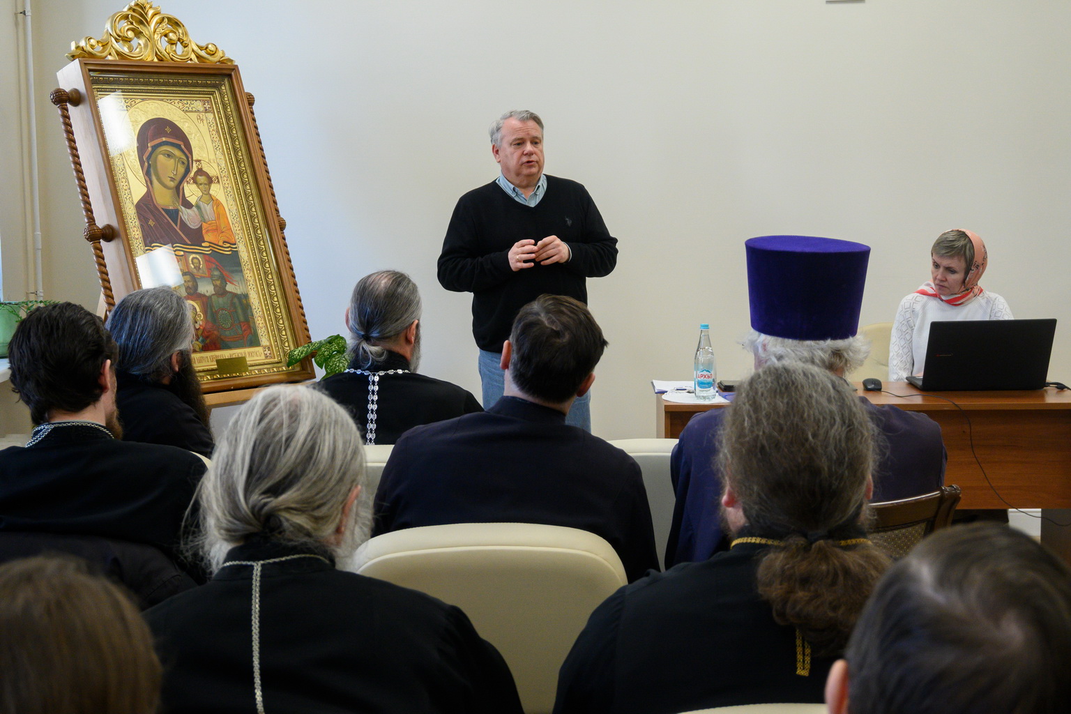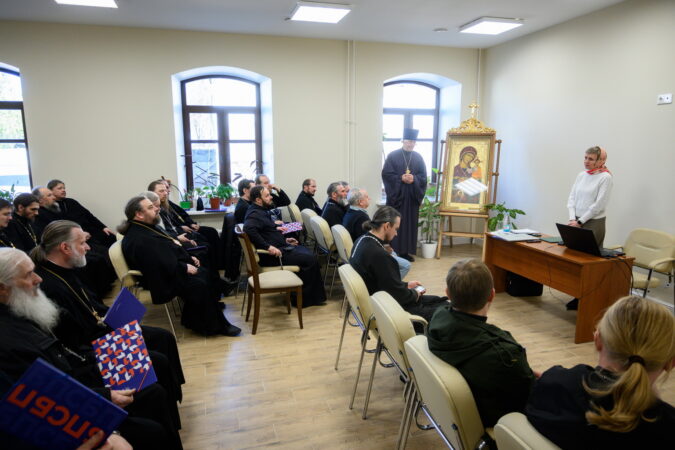 С докладом о деятельности паломнического центра «Обитель» для ветеранов СВО и их семей при Свято-Успенском Псково-Печерском монастыре выступила директор Юлия Зайцева. О насущных вопросах психологической реабилитации военнослужащих духовенству рассказал главный врач ГБУЗ «Псковский Госпиталь для ветеранов войн» Сергей Белявский.