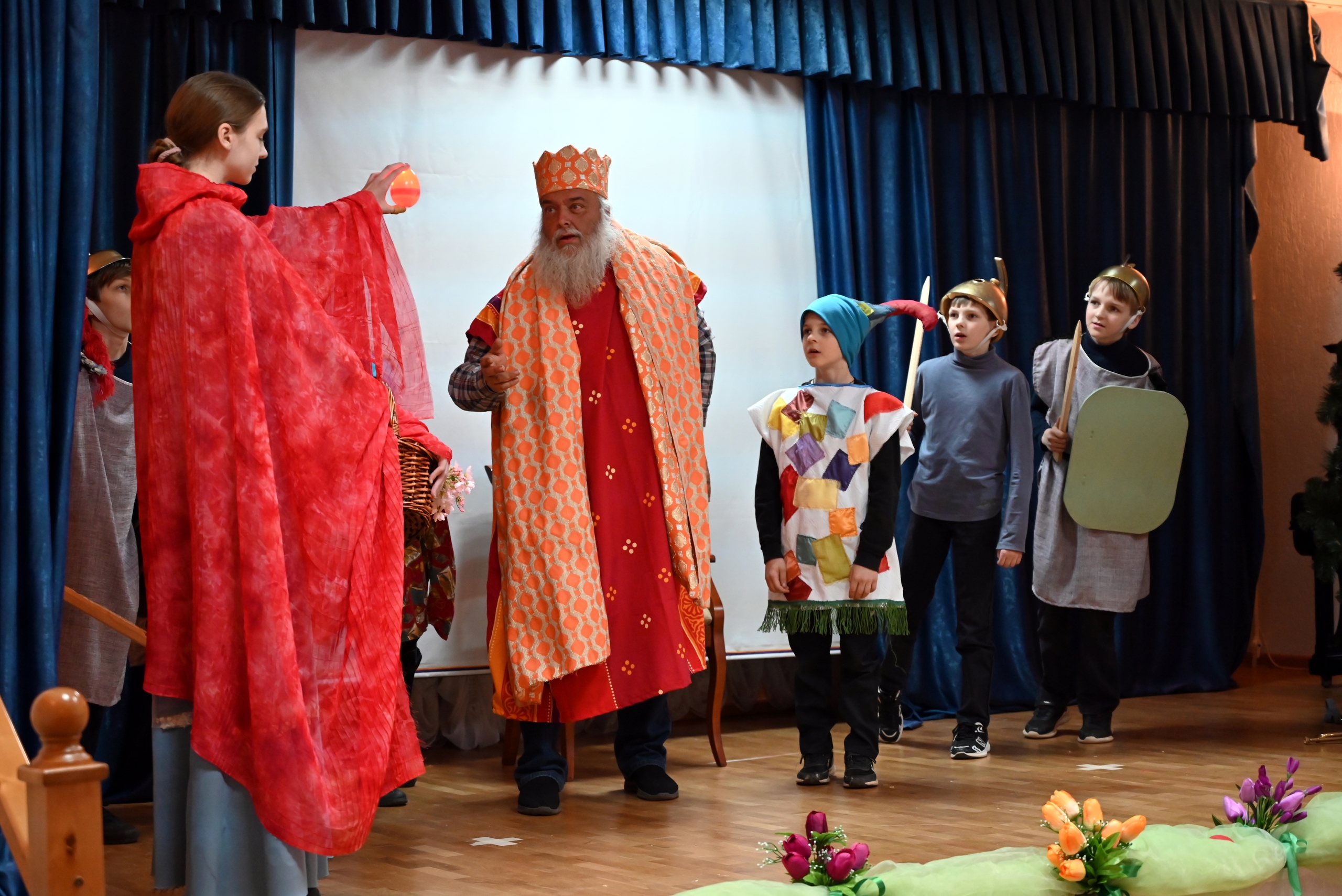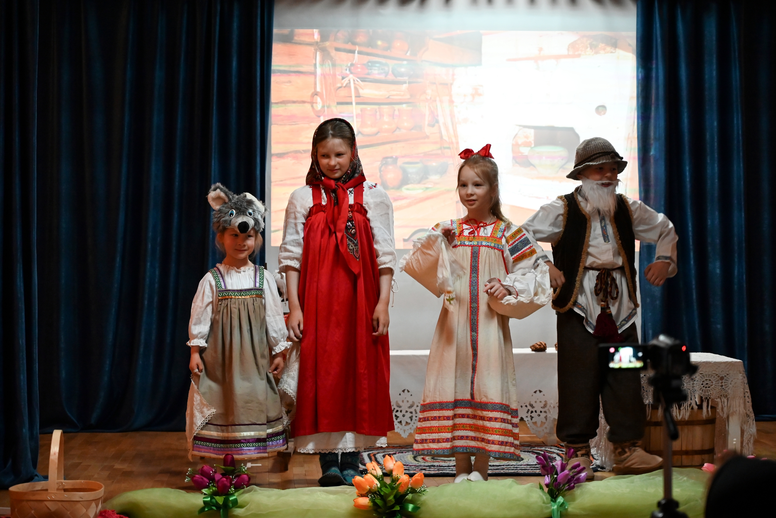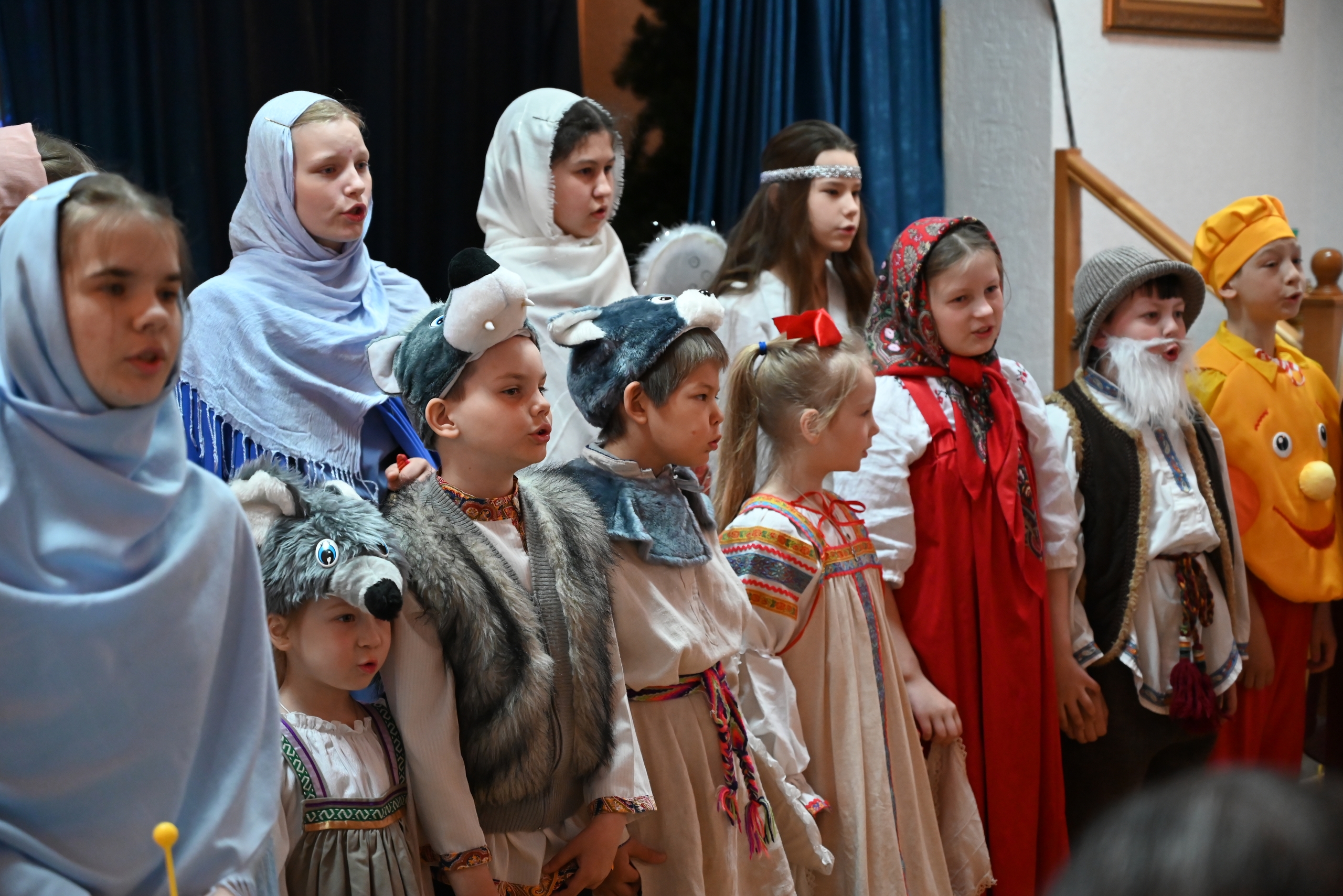 В красочном представлении дети прославили Воскресшего Господа праздничными песнопениями, русской сказкой о колобке и исторической постановкой.