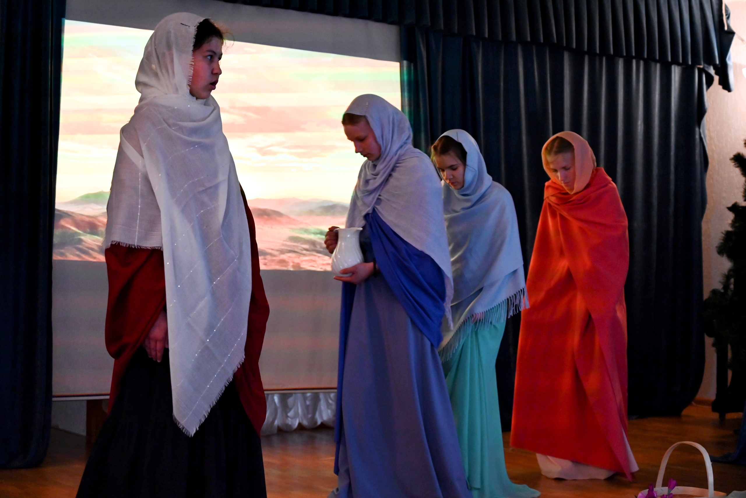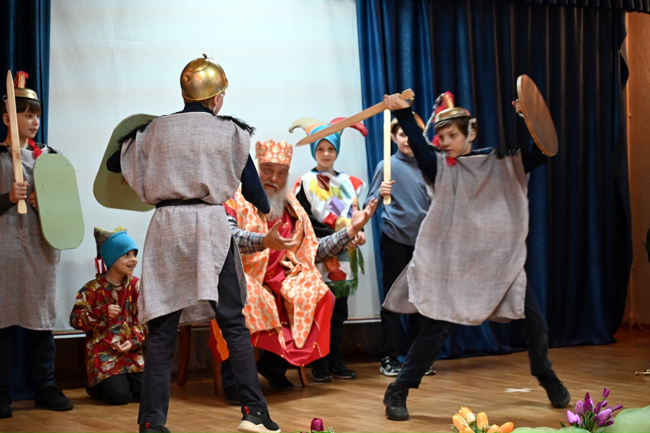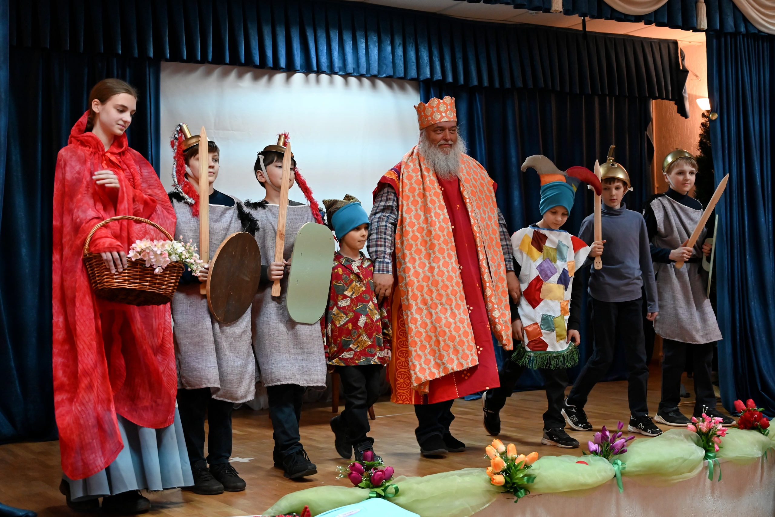 В красочном представлении дети прославили Воскресшего Господа праздничными песнопениями, русской сказкой о колобке и исторической постановкой.
