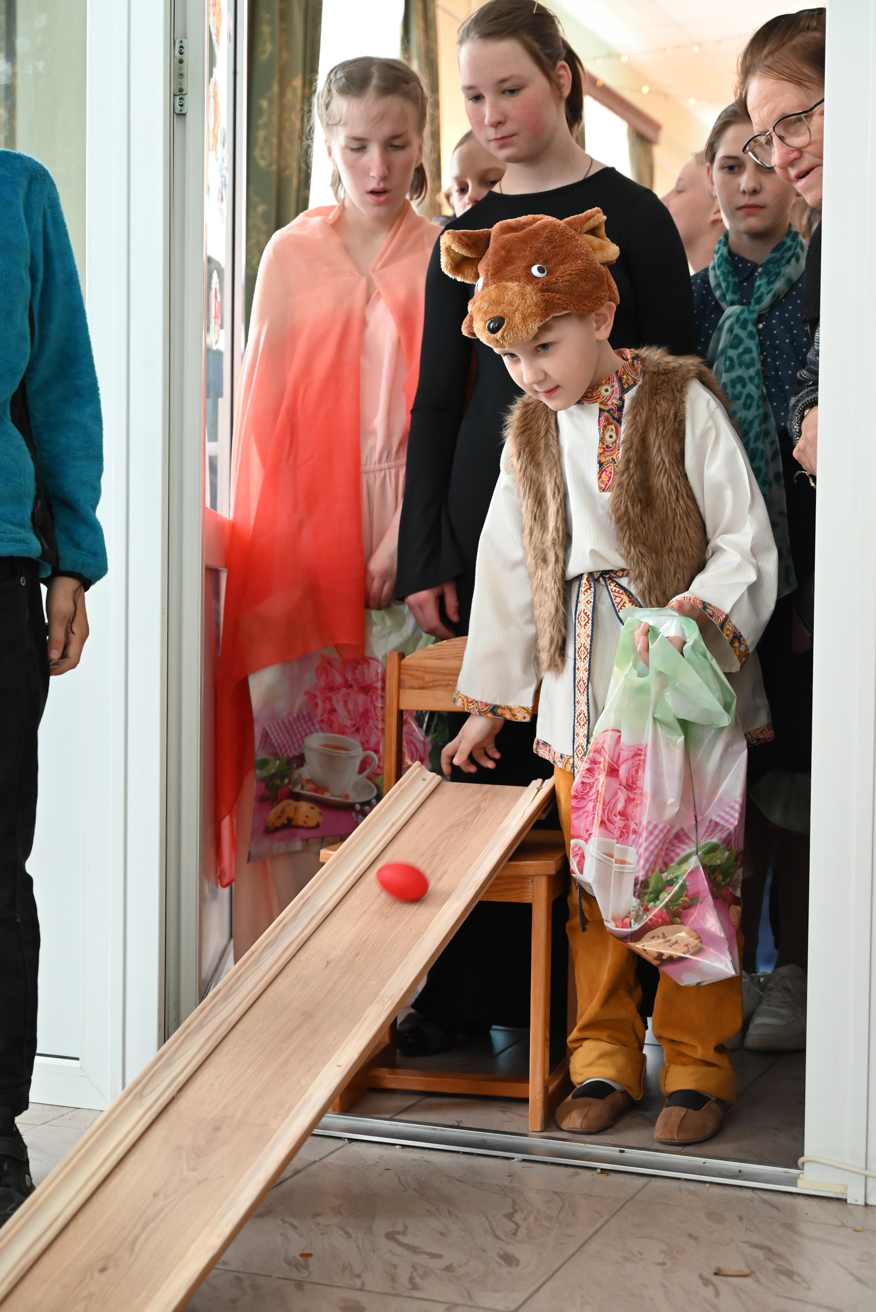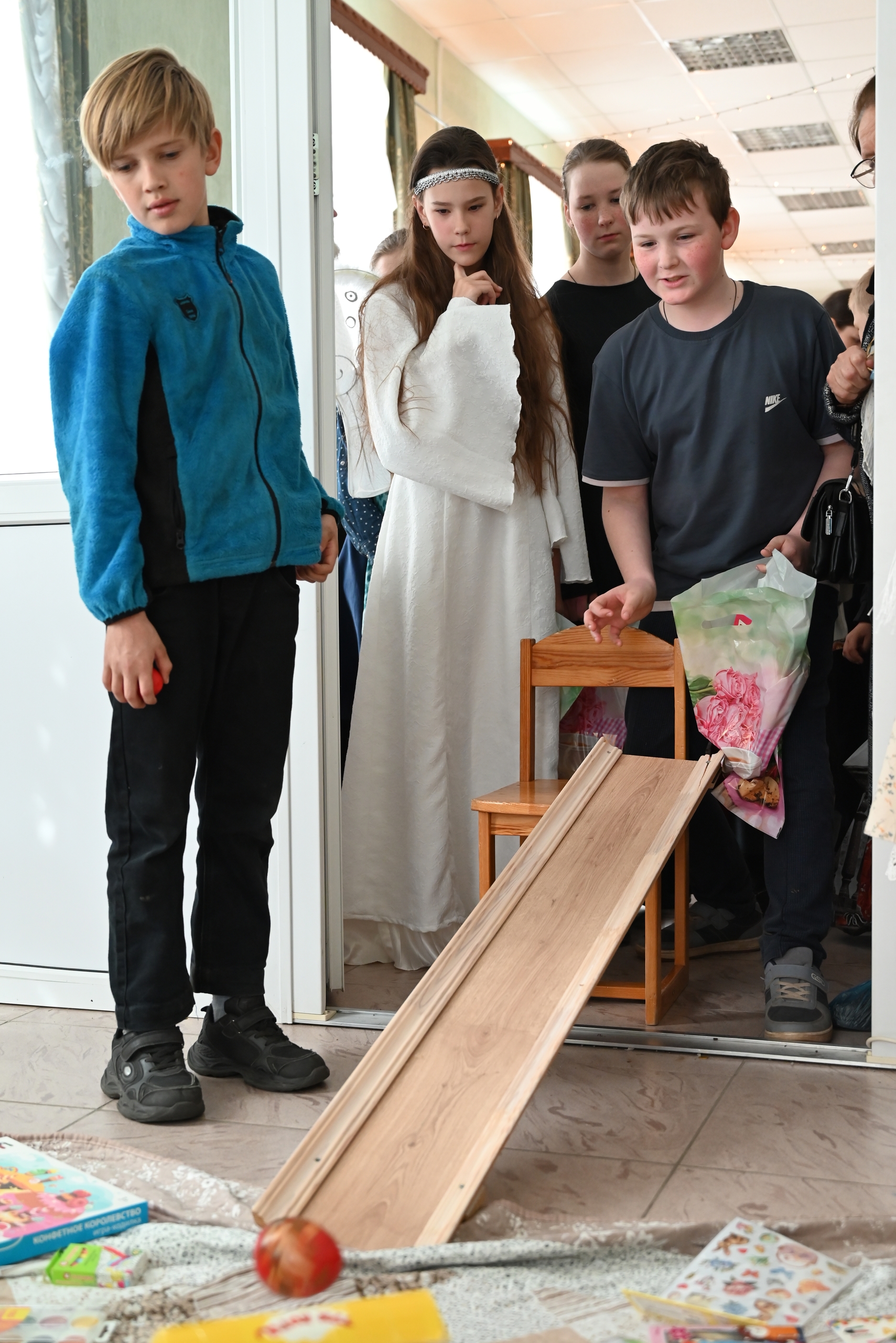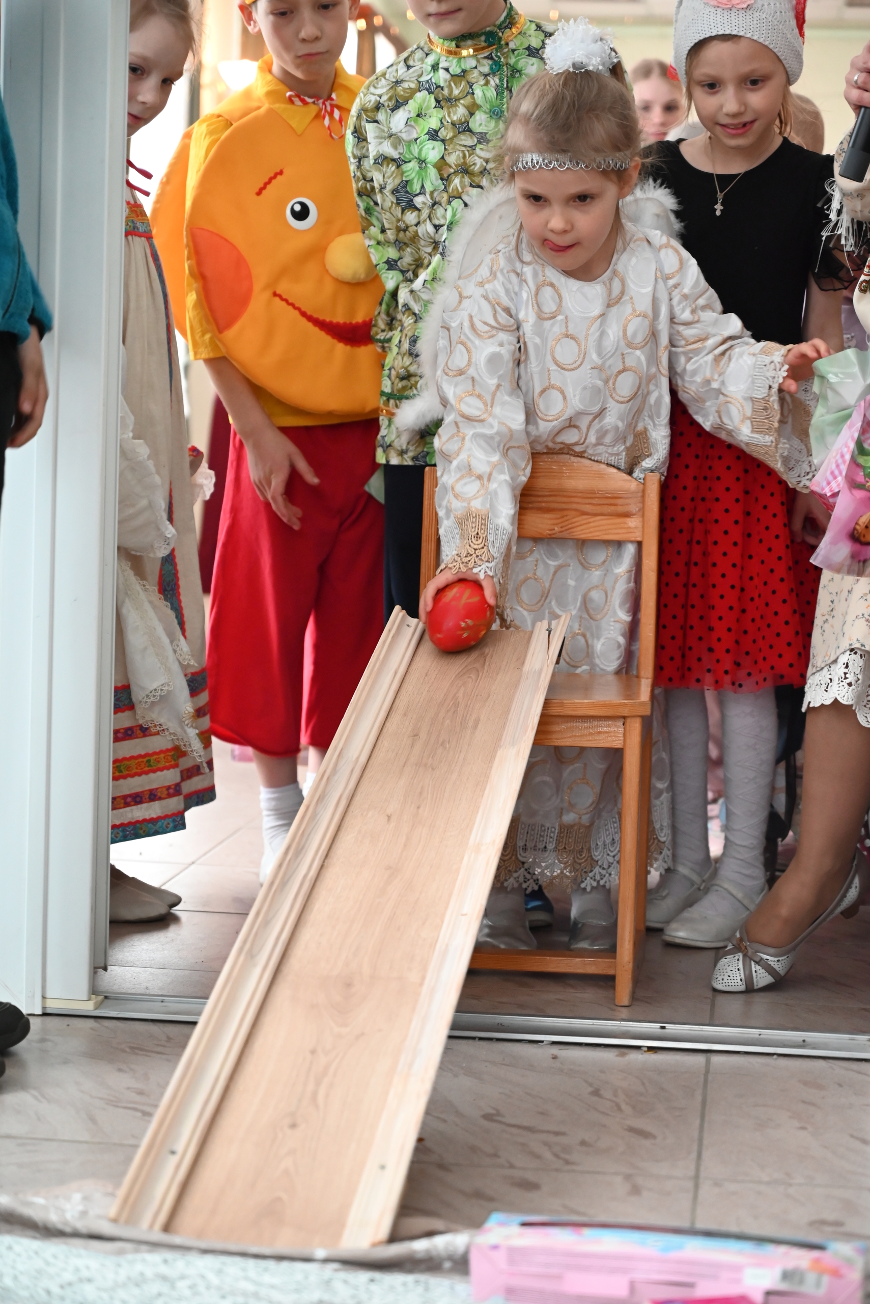 Также в завершение торжества прошли веселые игры с яйцами, которые по традиции называют Красной горкой. По условиям игры дети по очереди скатывают деревянное яйцо с горки. Тот предмет, которого первым коснется яйцо, ученики забирают себе в подарок.