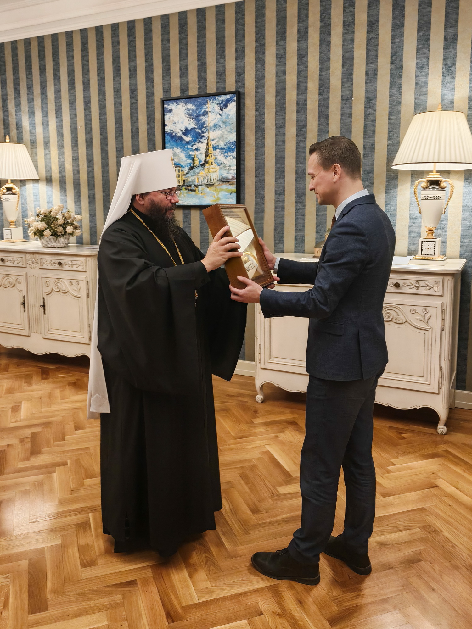 Владыка Матфей поздравил Александра Александровича с назначением на должность и вручил ему образ святого великомученика Георгия Победоносца.