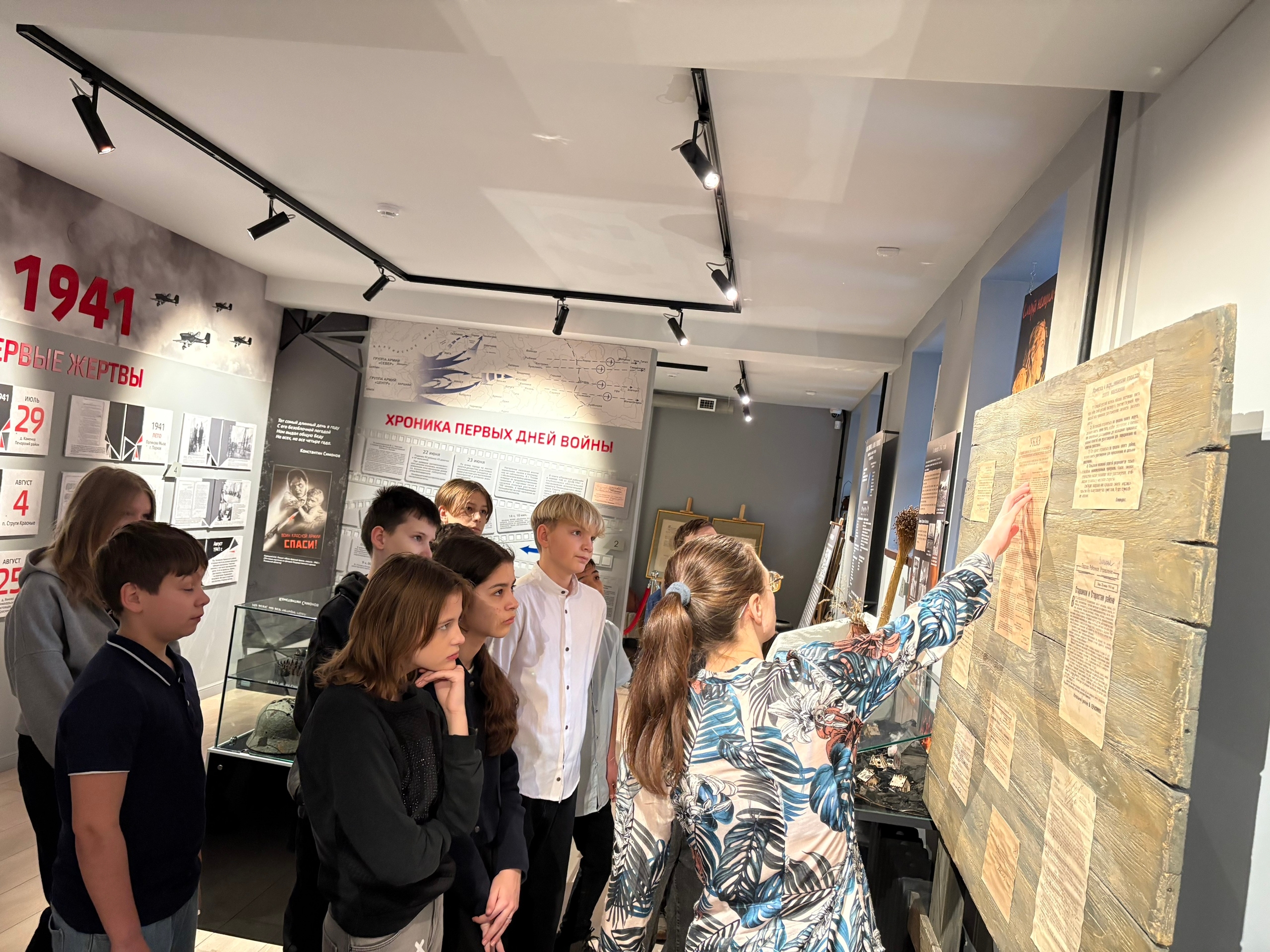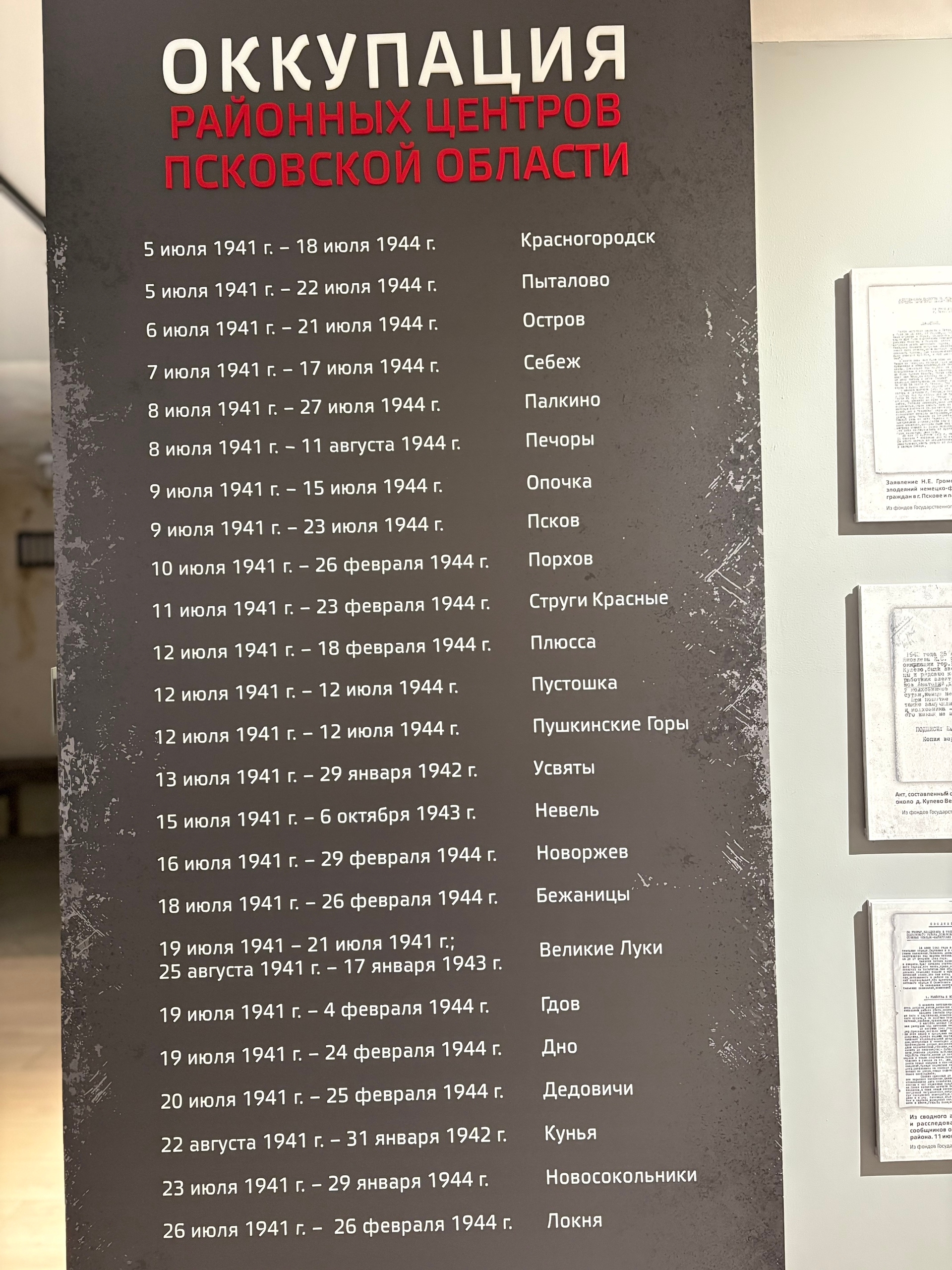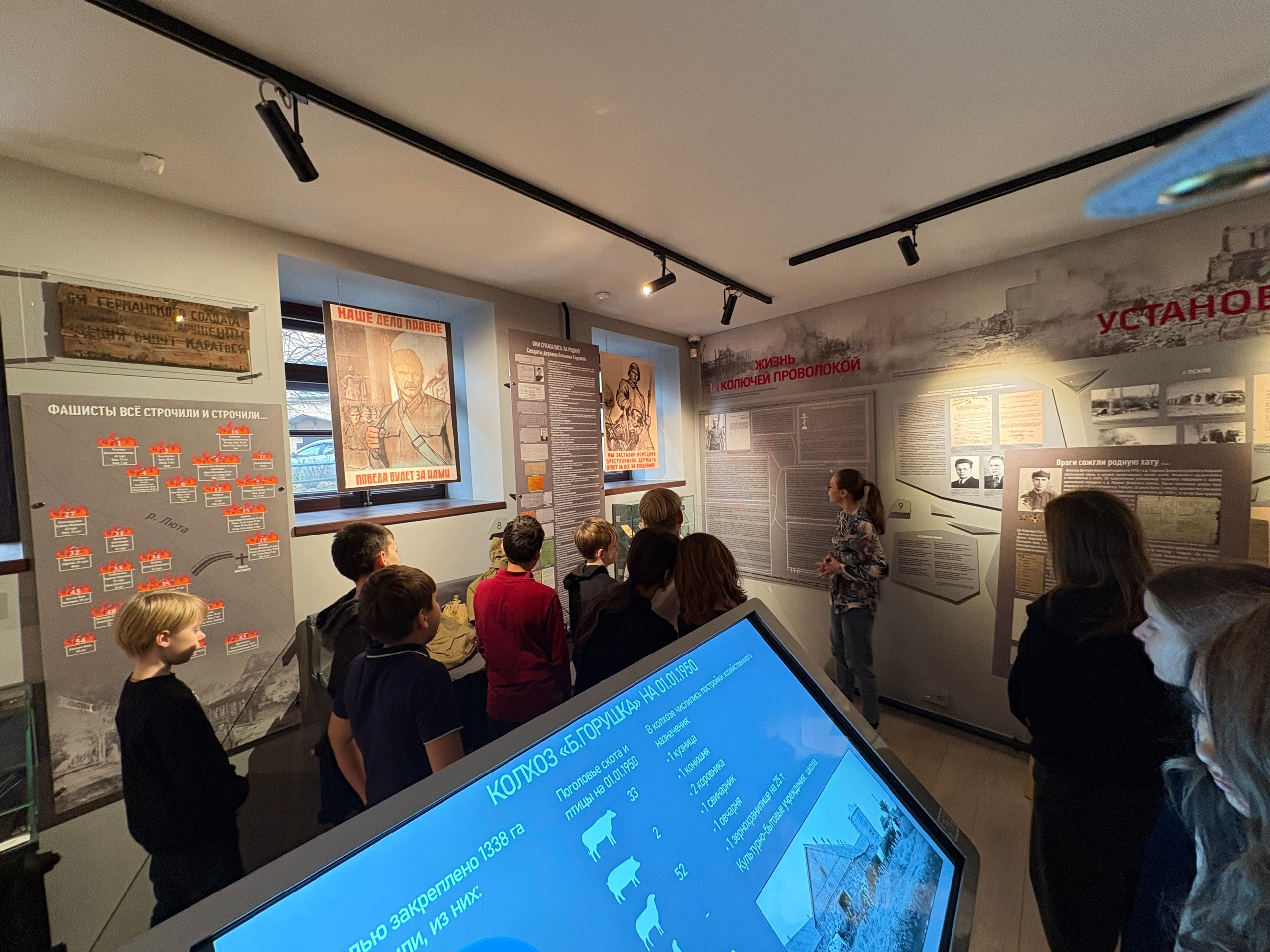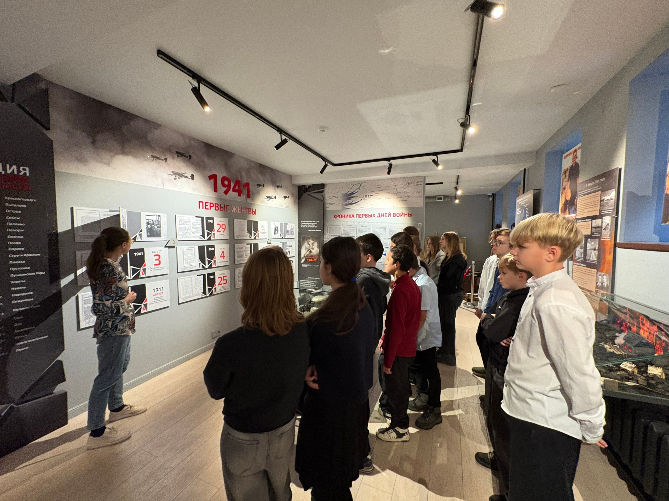 Музей посетили учащиеся средней школы №12 имени Героя России Алексея Ширяева с руководителями секции Яниной Орловой и Натальей Саратовой. На экскурсии ребята узнали, что за годы оккупации в Псковской области было сожжено более пяти тысяч деревень, и убито более 70 тысяч мирных жителей. А сам музей находится в здании, где в годы оккупации  размещался карательный орган эстонских полицаев, и в подвале находились камеры следственной тюрьмы, в которых содержались арестованные местные жители. На территории Псковщины было создано большое количество лагерей, в которых в нечеловеческих условиях содержались военнопленные и мирные граждане. Карта размещения этих концентрационных лагерей также есть в музее, а еще множество других архивных документов о зверствах фашистов.