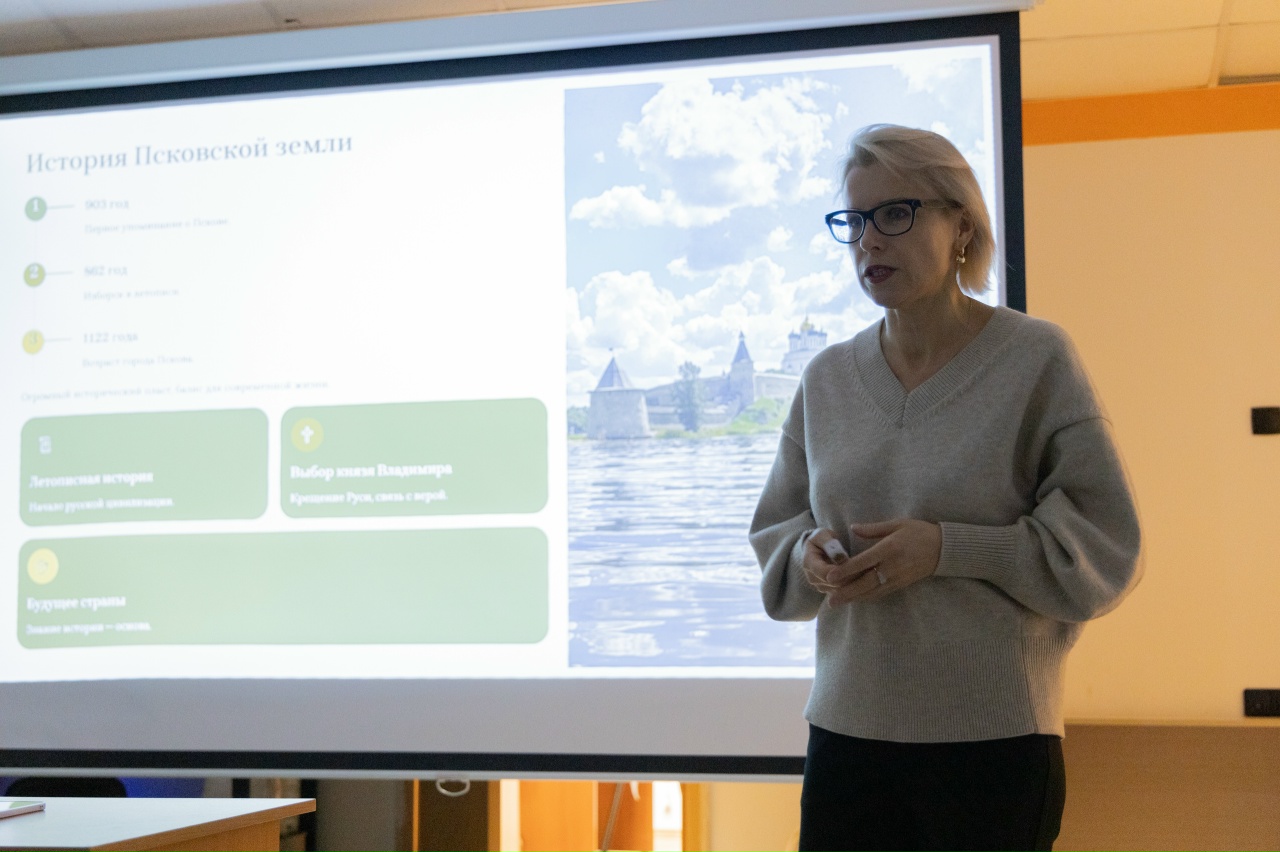 На лекции «Опыт успешной реализации краеведческих проектов, направленных на духовно-нравственное воспитание молодёжи» экскурсовод Марина Иванова рассказала, как можно изучать историю города через квесты и авторские сказки. Также познакомила слушателей с интересным и успешным краеведческим проектом «Тайны Псковских храмов».