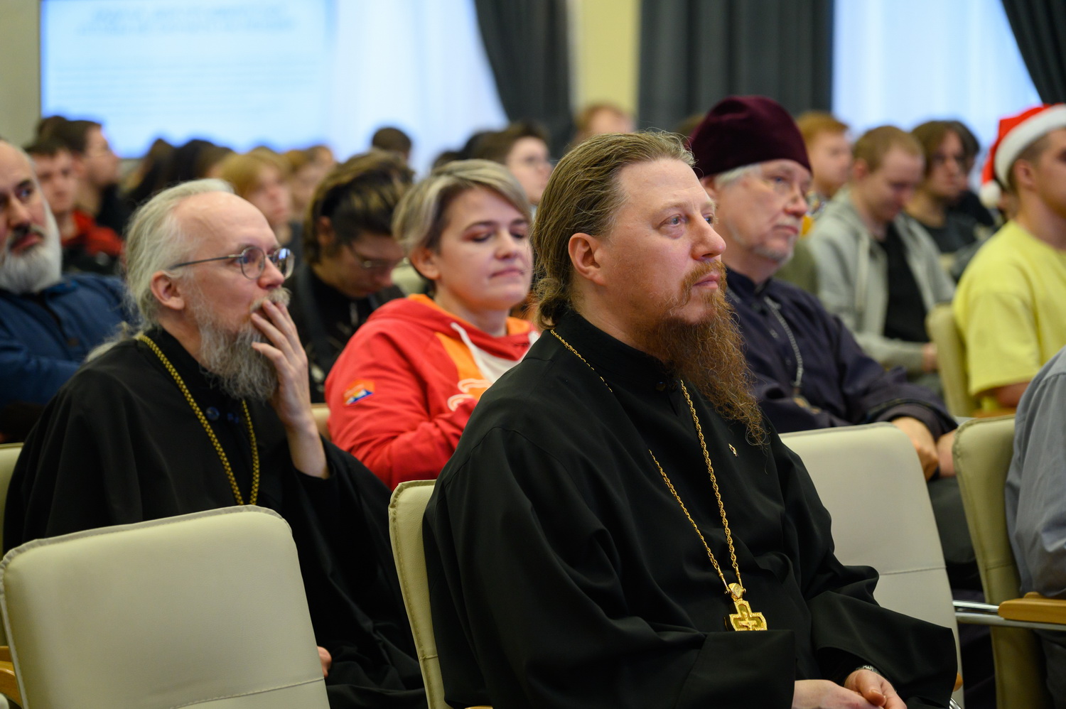 Слушателями лекции в актовом зале университета стали преподаватели и студенты ВУЗа, а также священнослужители.