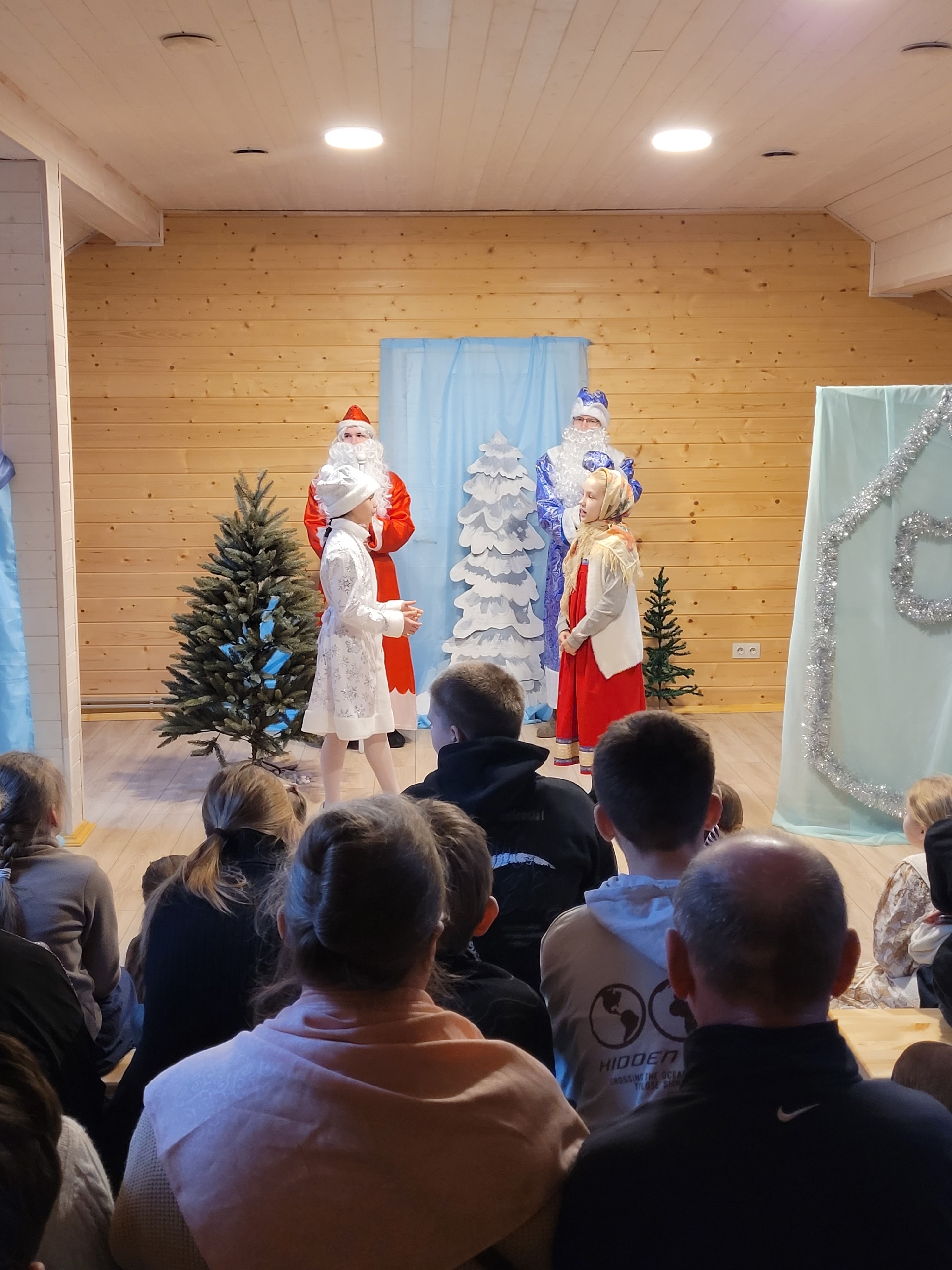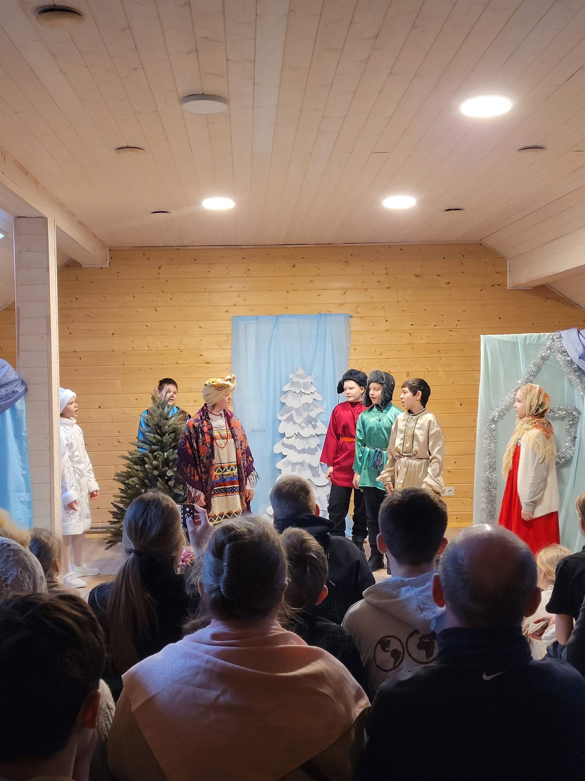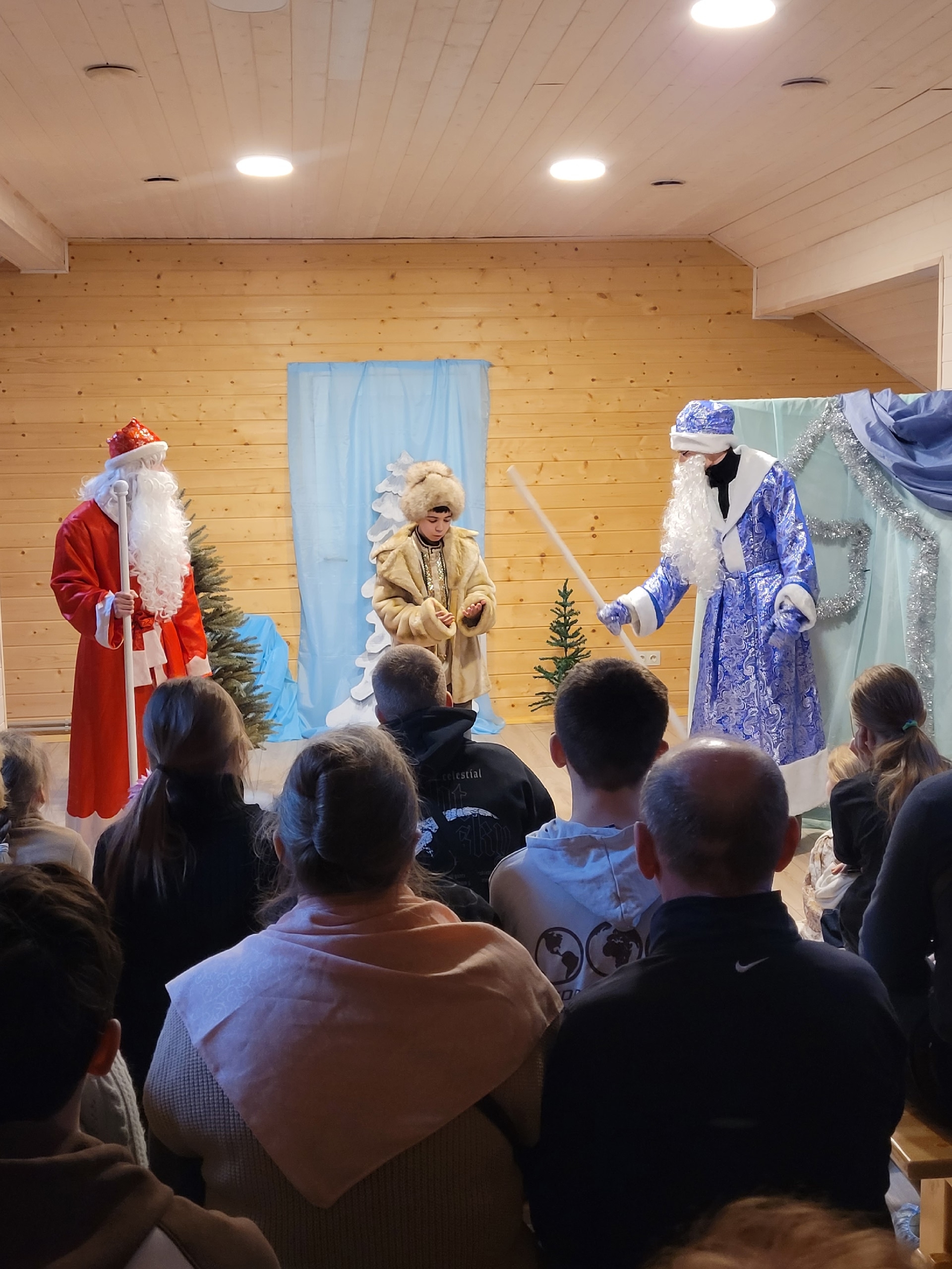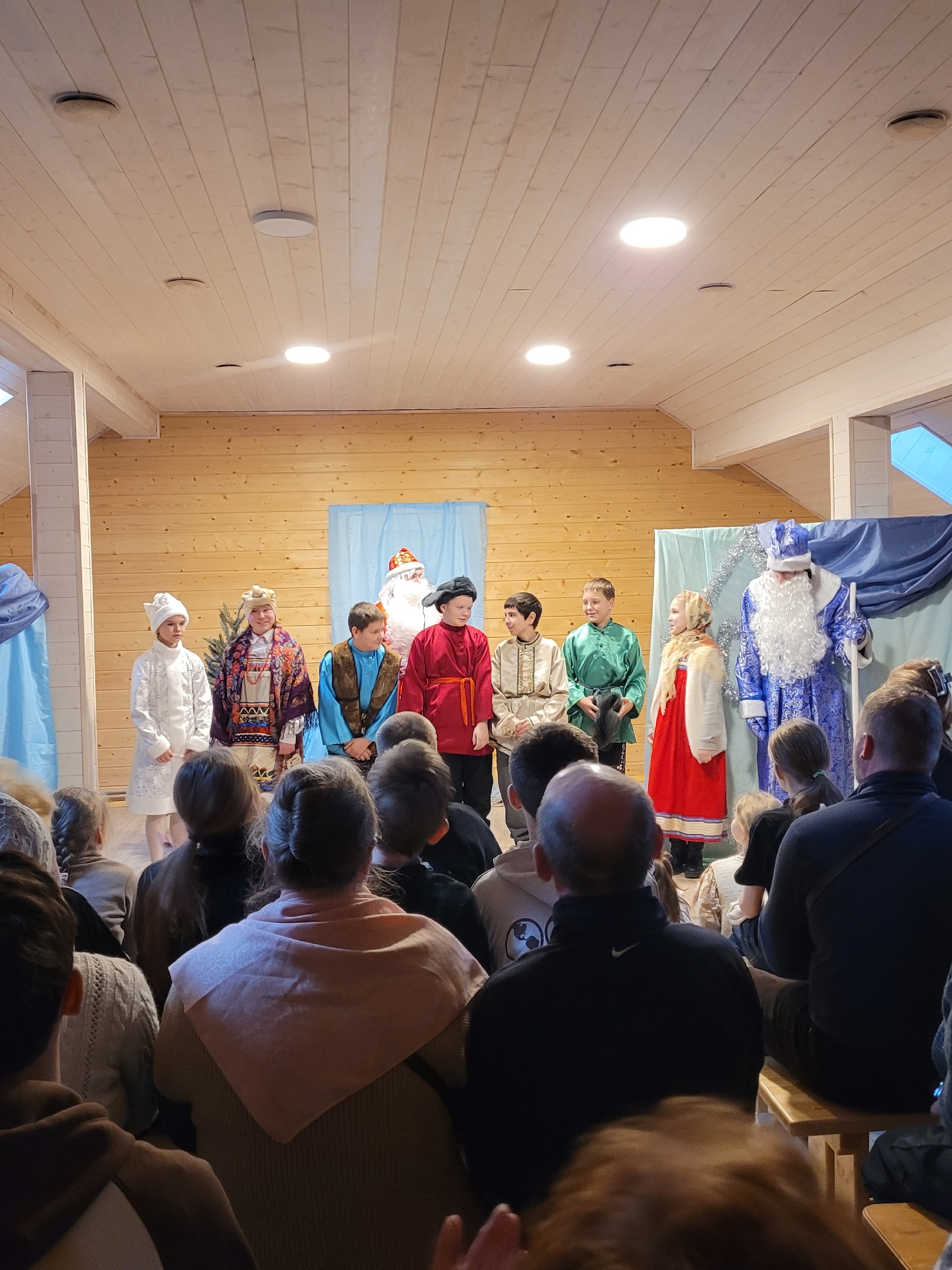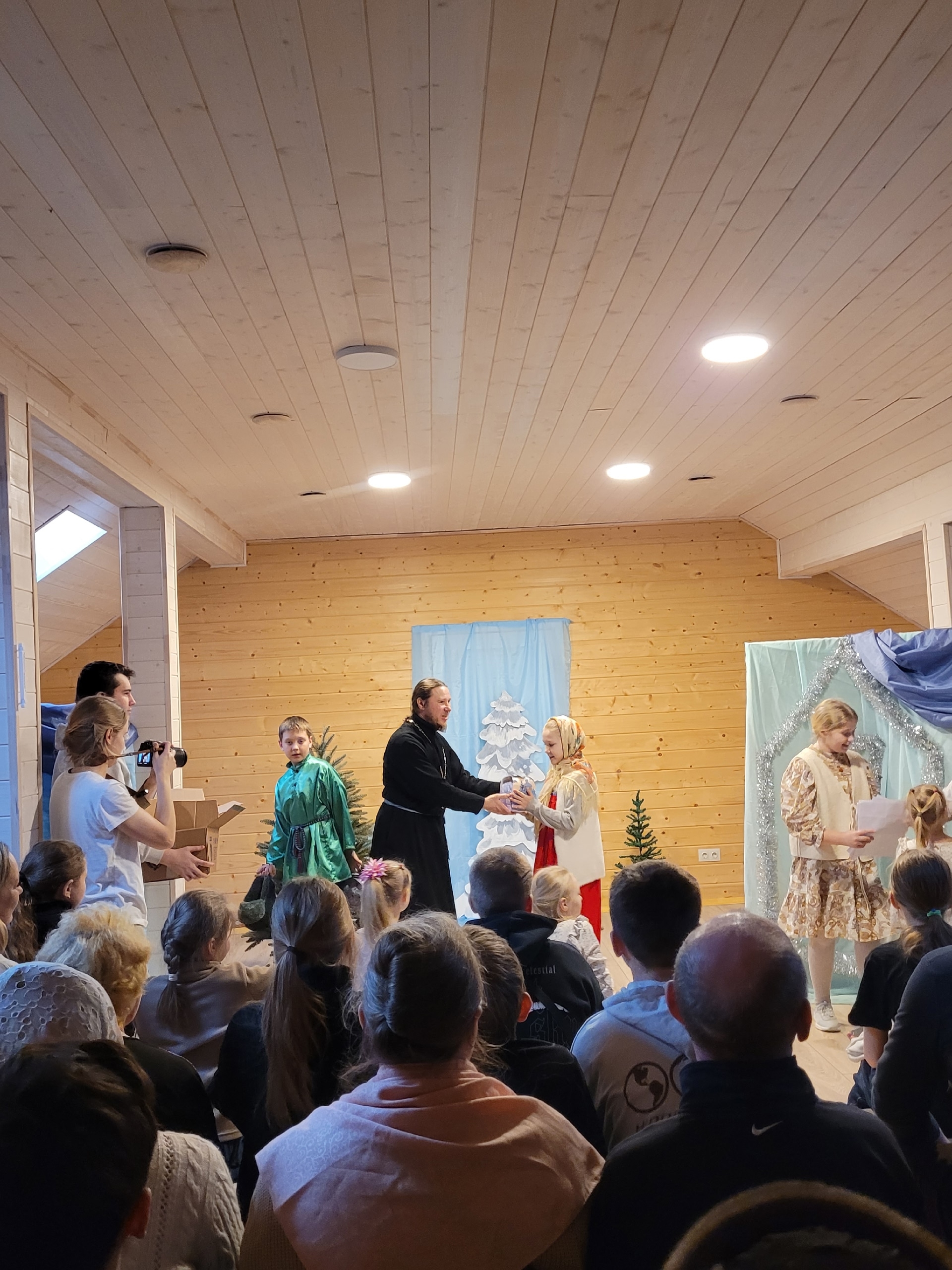 Затем воспитанники Воскресной школы показали гостям спектакль “Два Мороза”, а отец Димитрий вручил всем деткам сладкие подарки.