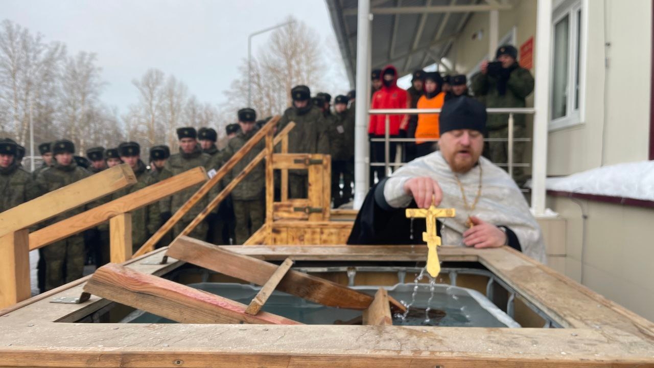 Затем священнослужители совершили чин Великого освящения воды в воинских частях. Также было освящено помещение, где расположена купель, предназначенная для мероприятий крещенского купания воинов.