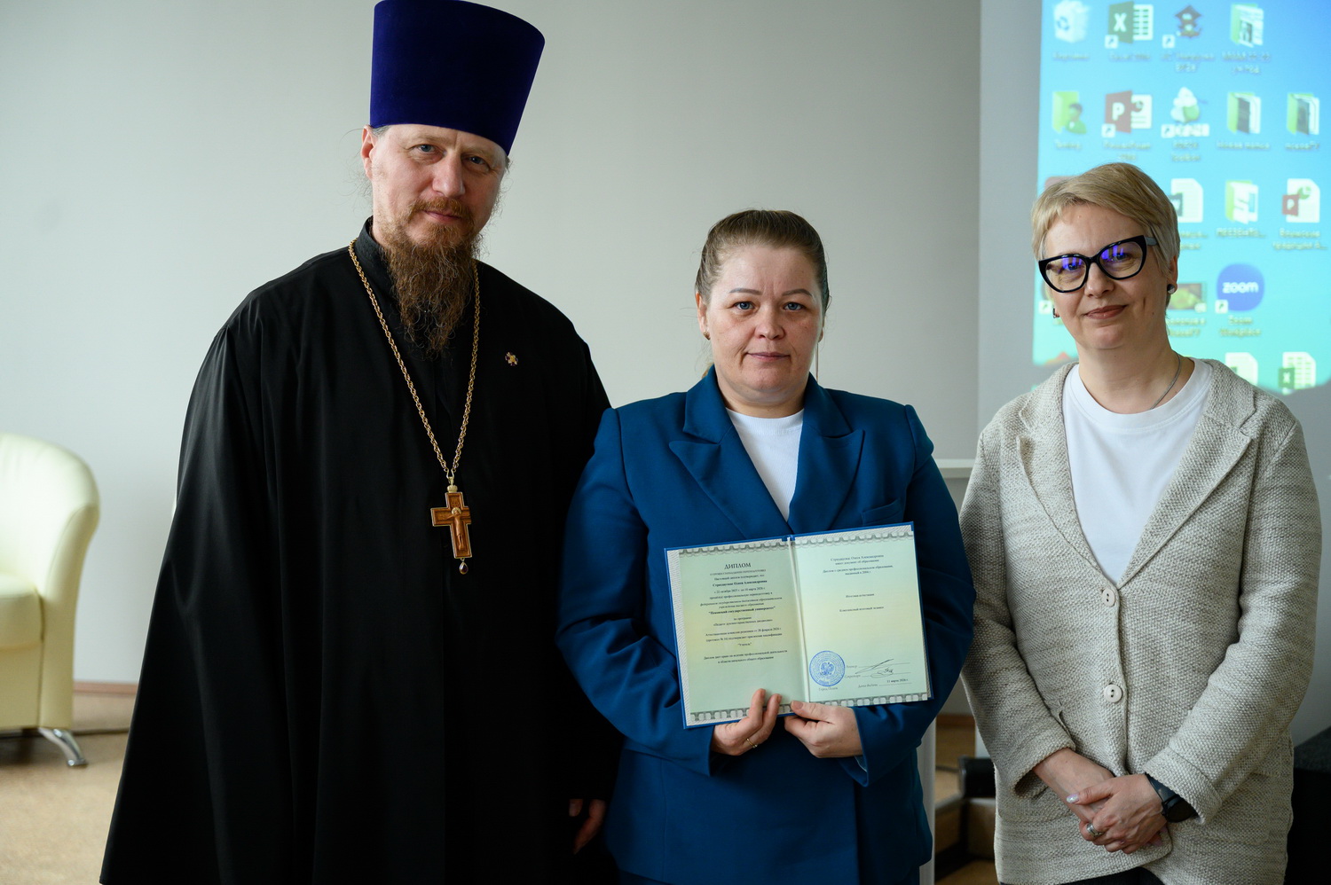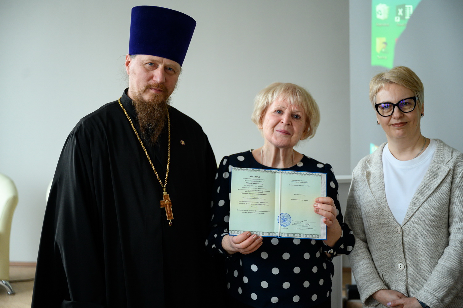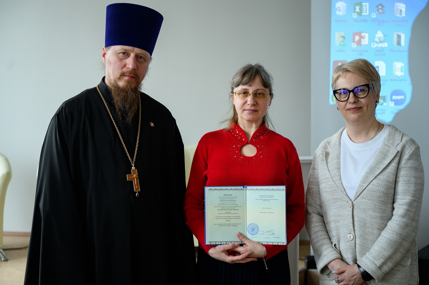 Семинар начался с приветственных слов к выпускникам третьего потока программы профессиональной переподготовки «Педагог духовно-нравственных дисциплин». Затем дипломы выпускникам вручили: директор Института гуманитарных наук и языковых коммуникаций Наталья Молчанова, руководитель Отдела религиозного образования и катехизации Псковской епархии протоиерей Роман Ледин и руководитель образовательной программы «Педагог духовно-нравственных дисциплин » Марина Манойлова.