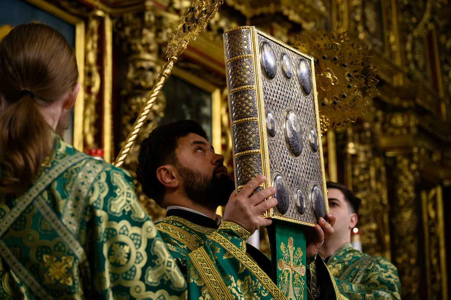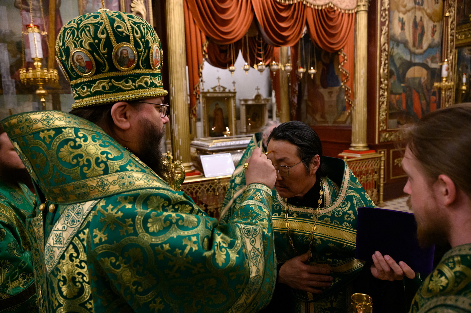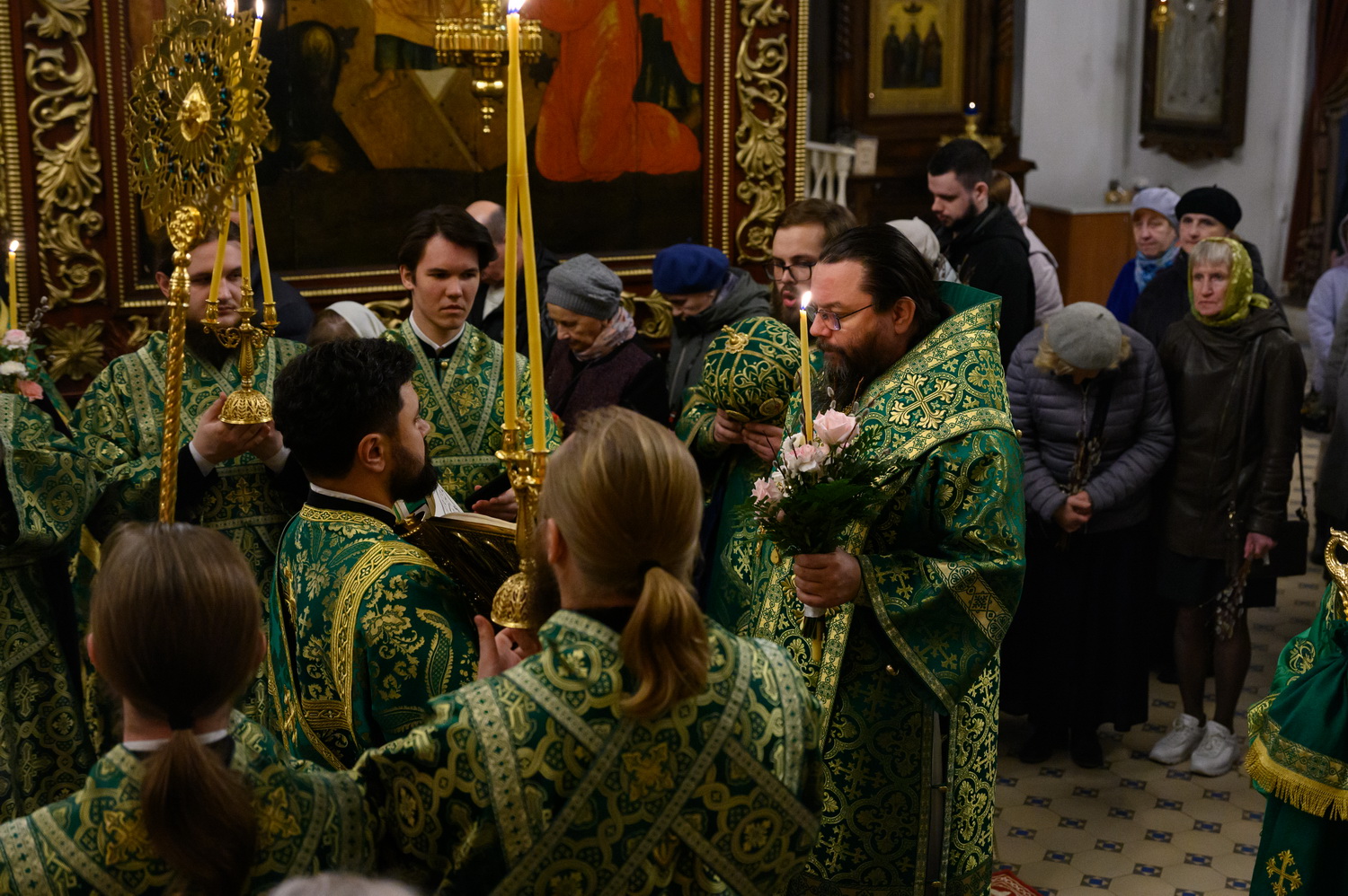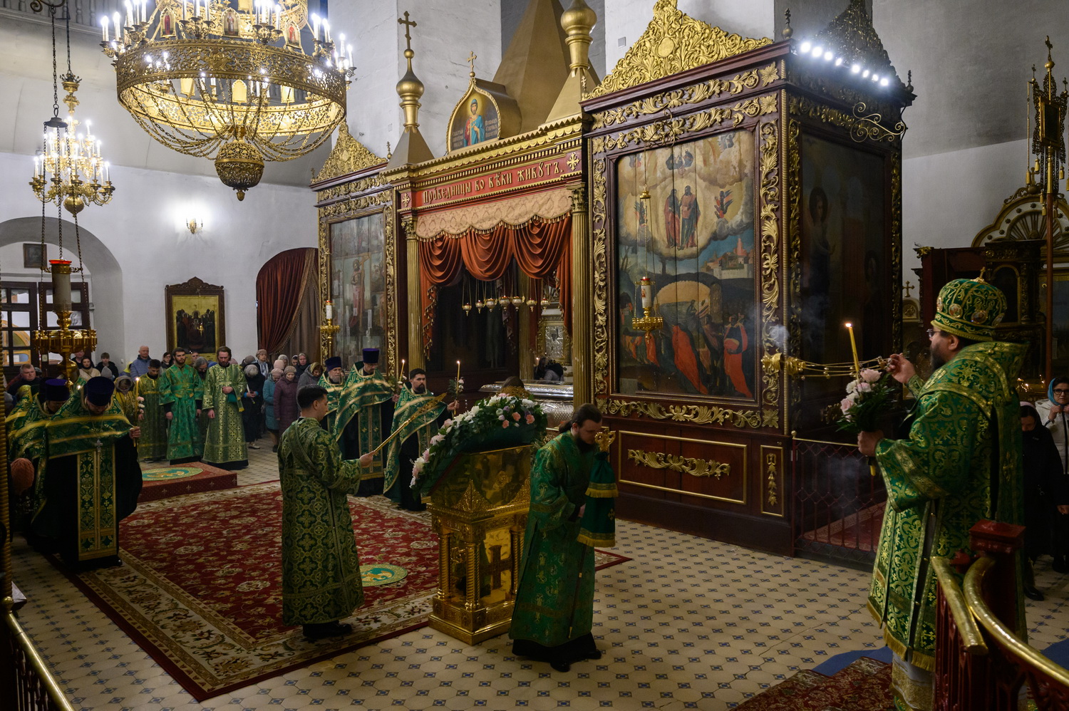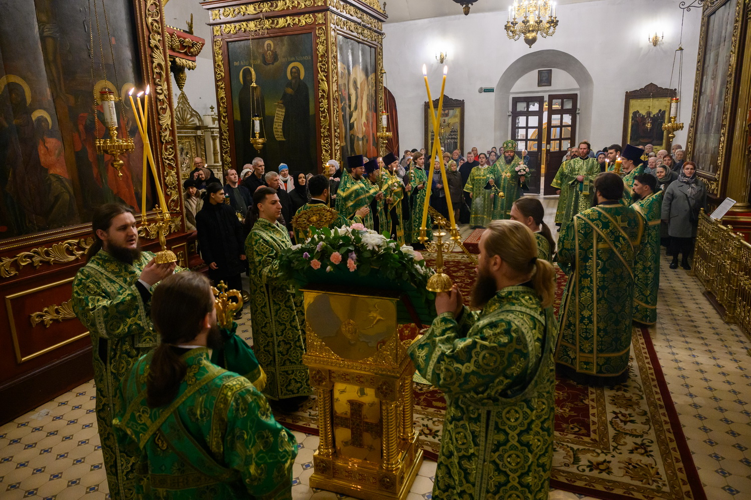 Его Высокопреосвященству сослужили настоятель кафедрального собора иерей Александр Короплясов с соборным духовенством, клирик храма в честь иконы Божией Матери «Спорительница хлебов» Патриаршего подворья в станице Приазовской Краснодарского края иерей Роман Хан. Песнопения всенощного бдения исполнил Архиерейский хор Псково-Печерского монастыря под управлением Виктории Зарудней.