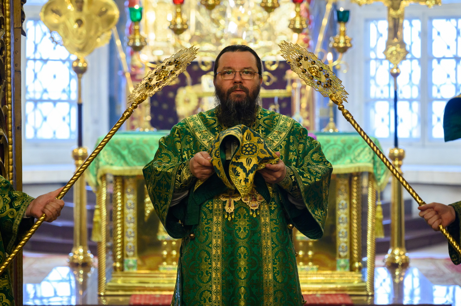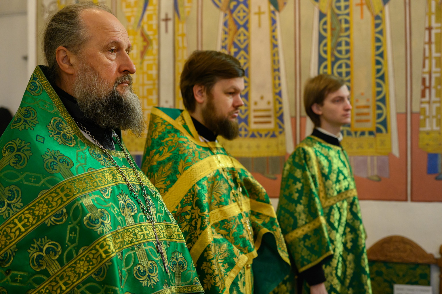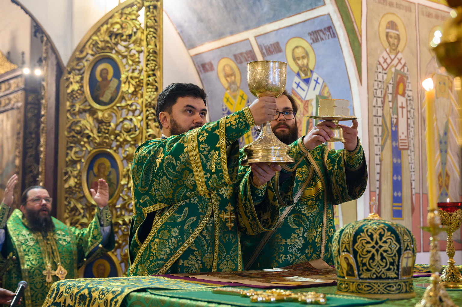 Его Высокопреосвященству сослужили: настоятель Свято-Троицкого собора иерей Александр Короплясов с соборным духовенством, клирик храма в честь иконы Божией Матери «Спорительница хлебов» Патриаршего подворья в станице Приазовской Краснодарского края иерей Роман Хан, насельники Свято-Успенского Псково-Печерского монастыря иеромонах Гавриил (Асташкин) и иеромонах Никон (Горохов).