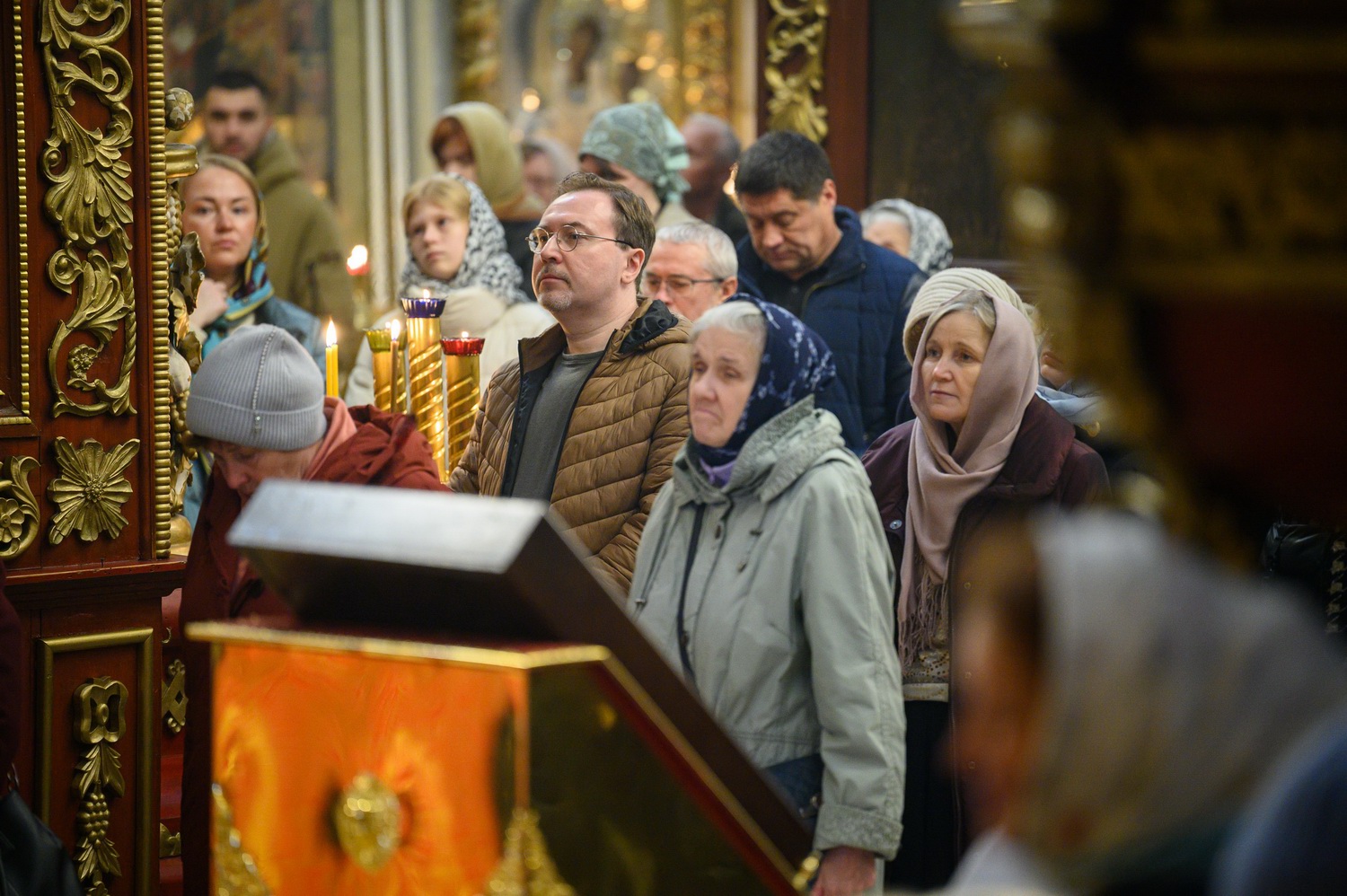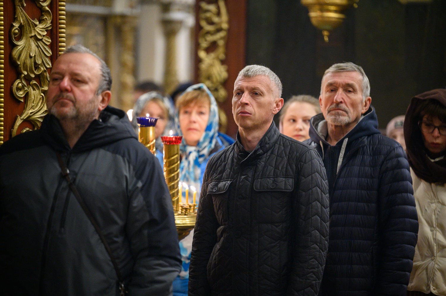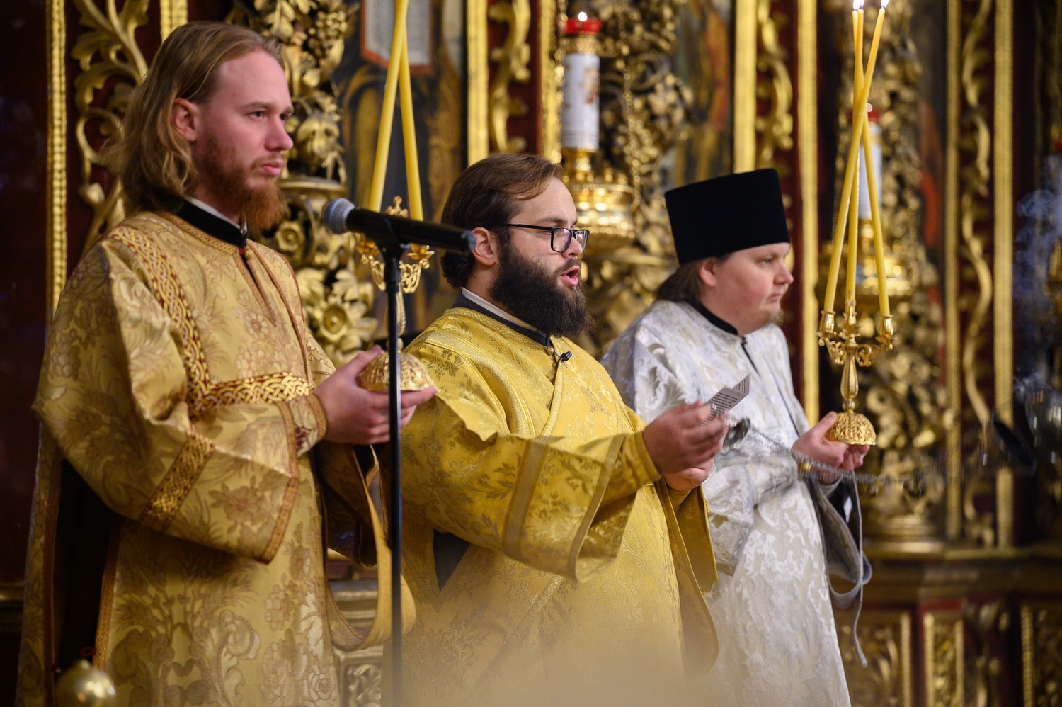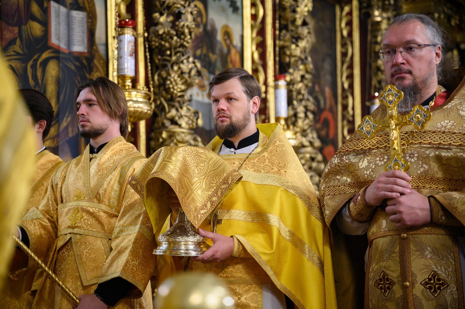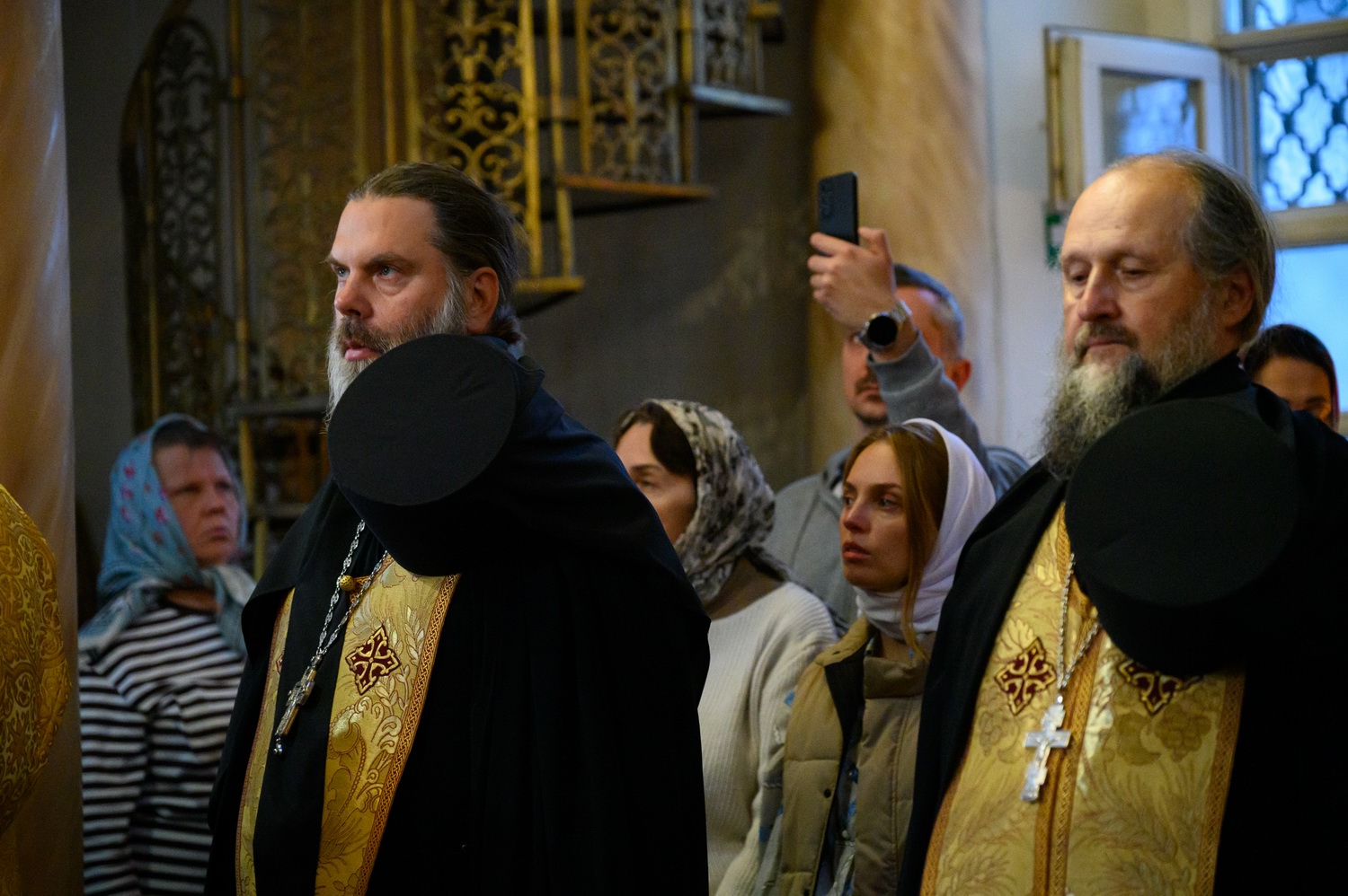 За Литургией Его Святейшеству сослужили: митрополит Воскресенский Григорий, управляющий делами Московской Патриархии, первый викарий Патриарха Московского и всея Руси по городу Москве, наместник Новоспасского ставропигиального монастыря; митрополит Владимирский и Суздальский Никандр, председатель Финансово-хозяйственного управления Московского Патриархата; митрополит Псковский и Порховский Матфей, бывший управляющий Северо-Восточным викариатством, распоряжением Святейшего Патриарха Кирилла от 2 августа 2024 года назначенный, в дополнение к несомым послушаниям, ответственным за строительство Успенского храма в Останкине; митрополит Звенигородский Арсений; епископ Раменский Алексий, личный секретарь Его Святейшества; епископ Бронницкий Иоанн, наместник Высоко-Петровского ставропигиального монастыря; протопресвитер Владимир Диваков, секретарь Патриарха Московского и всея Руси по г. Москве; протоиерей Анатолий Алефиров; протоиерей Георгий Климов; столичное духовенство.