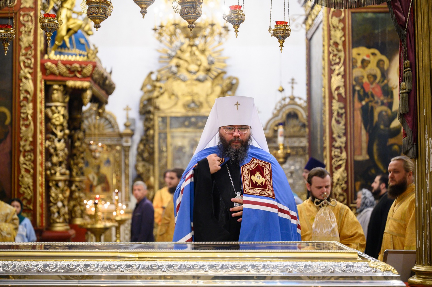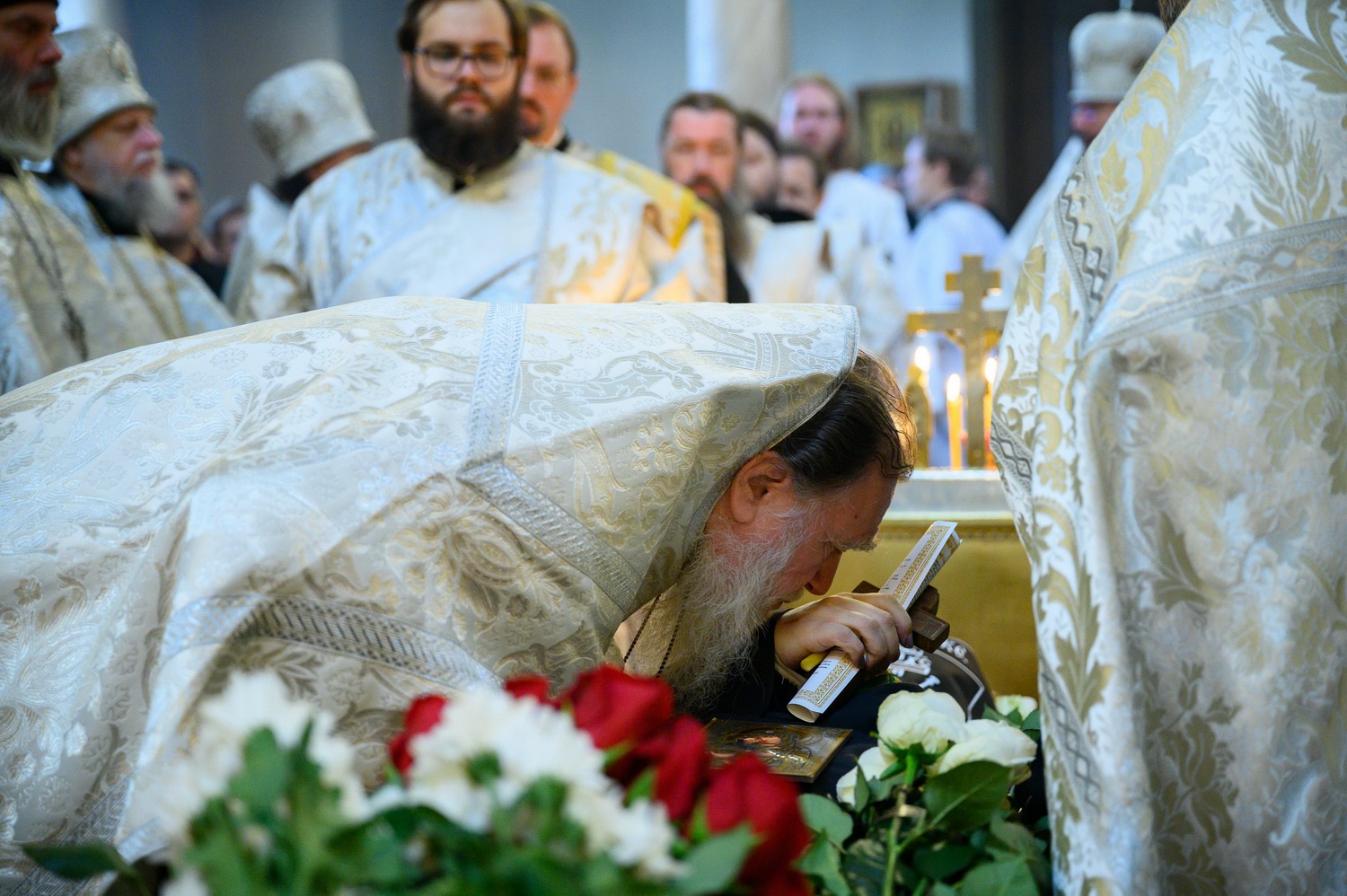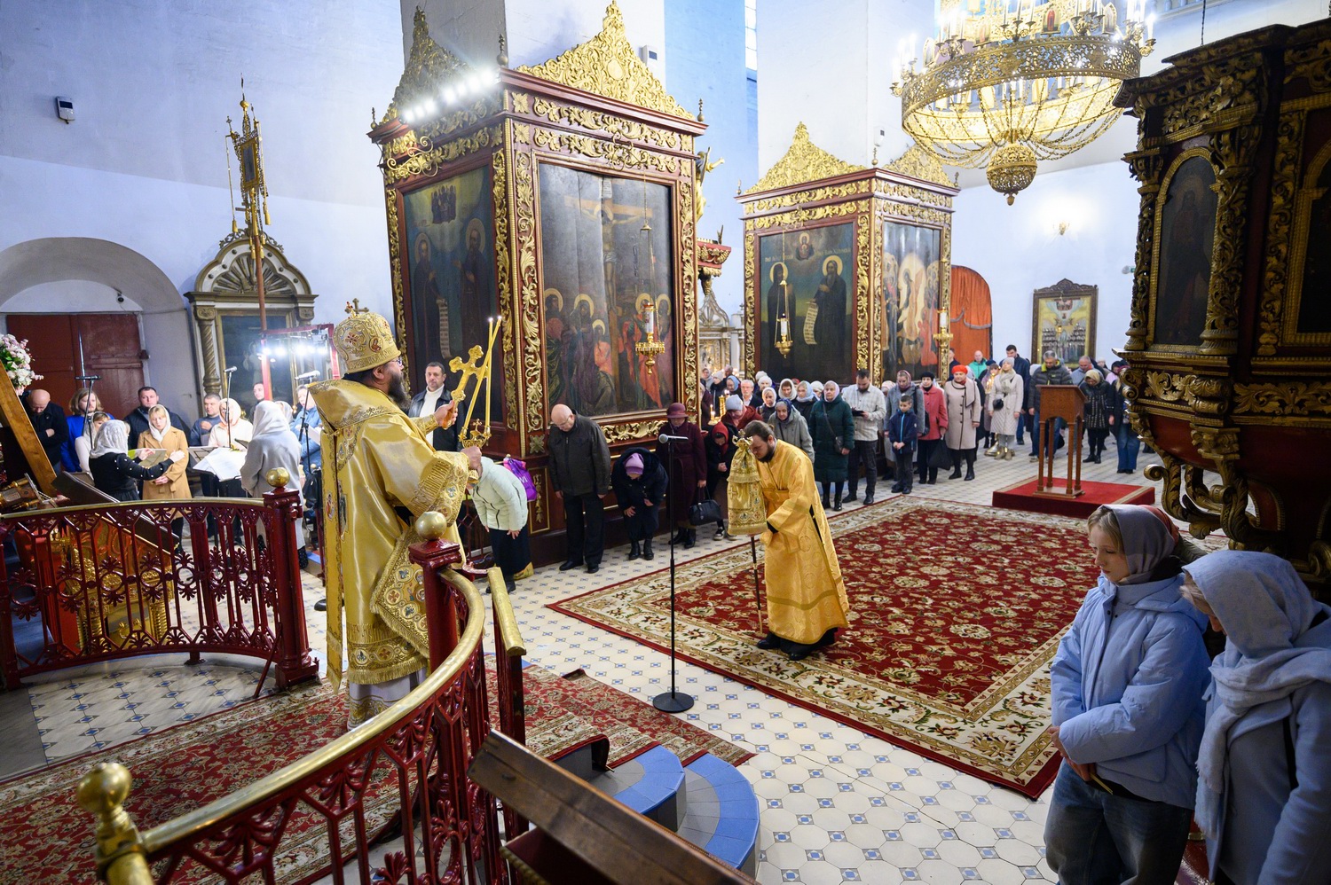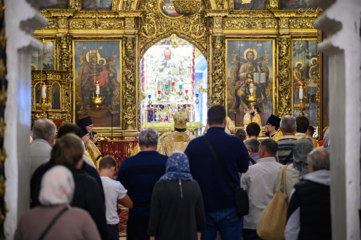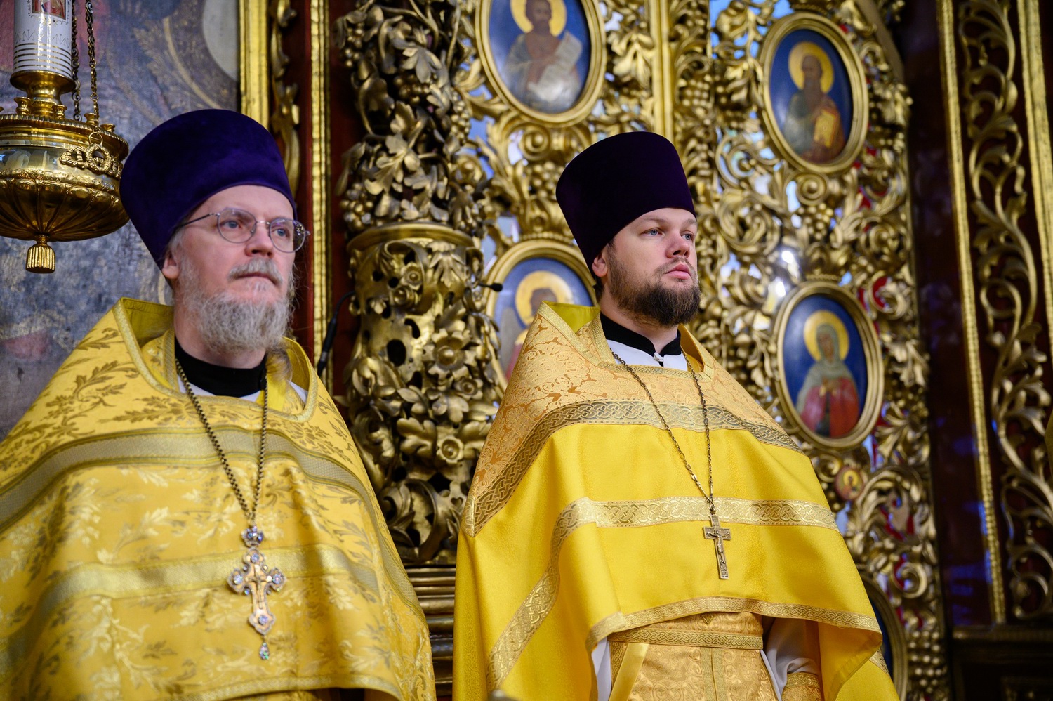 За Литургией Его Святейшеству сослужили: митрополит Воскресенский Григорий, управляющий делами Московской Патриархии, первый викарий Патриарха Московского и всея Руси по городу Москве, наместник Новоспасского ставропигиального монастыря; митрополит Владимирский и Суздальский Никандр, председатель Финансово-хозяйственного управления Московского Патриархата; митрополит Псковский и Порховский Матфей, бывший управляющий Северо-Восточным викариатством, распоряжением Святейшего Патриарха Кирилла от 2 августа 2024 года назначенный, в дополнение к несомым послушаниям, ответственным за строительство Успенского храма в Останкине; митрополит Звенигородский Арсений; епископ Раменский Алексий, личный секретарь Его Святейшества; епископ Бронницкий Иоанн, наместник Высоко-Петровского ставропигиального монастыря; протопресвитер Владимир Диваков, секретарь Патриарха Московского и всея Руси по г. Москве; протоиерей Анатолий Алефиров; протоиерей Георгий Климов; столичное духовенство.
