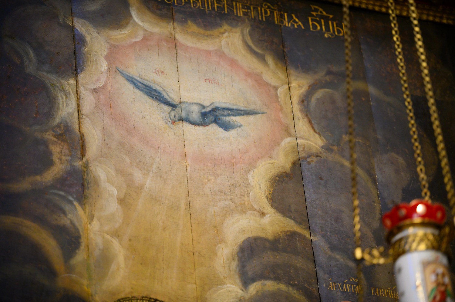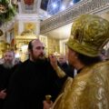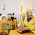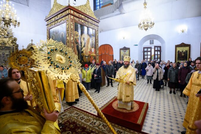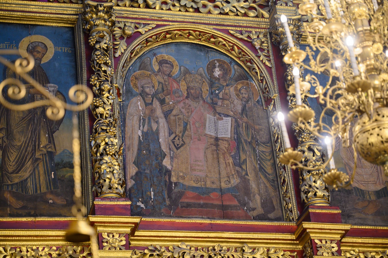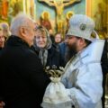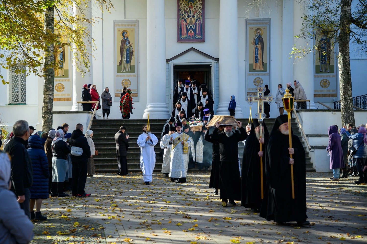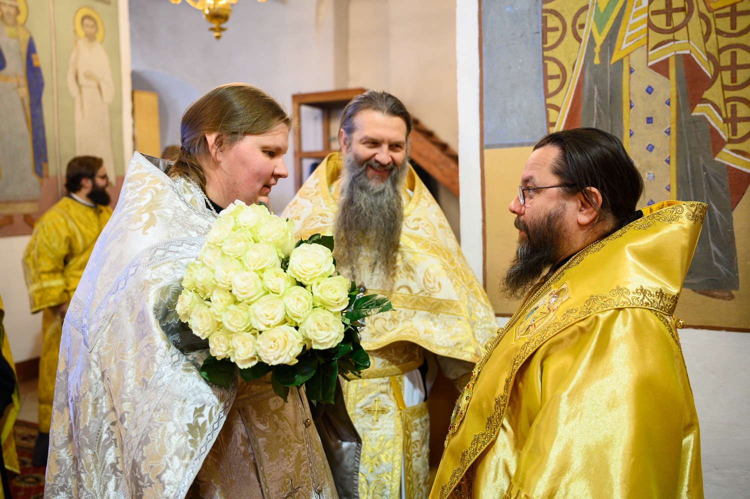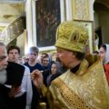 По окончании Литургии митрополит Псковский Матфей приветствовал Святейшего Патриарха Кирилла и преподнес Его Святейшеству икону Успения Пресвятой Богородицы.