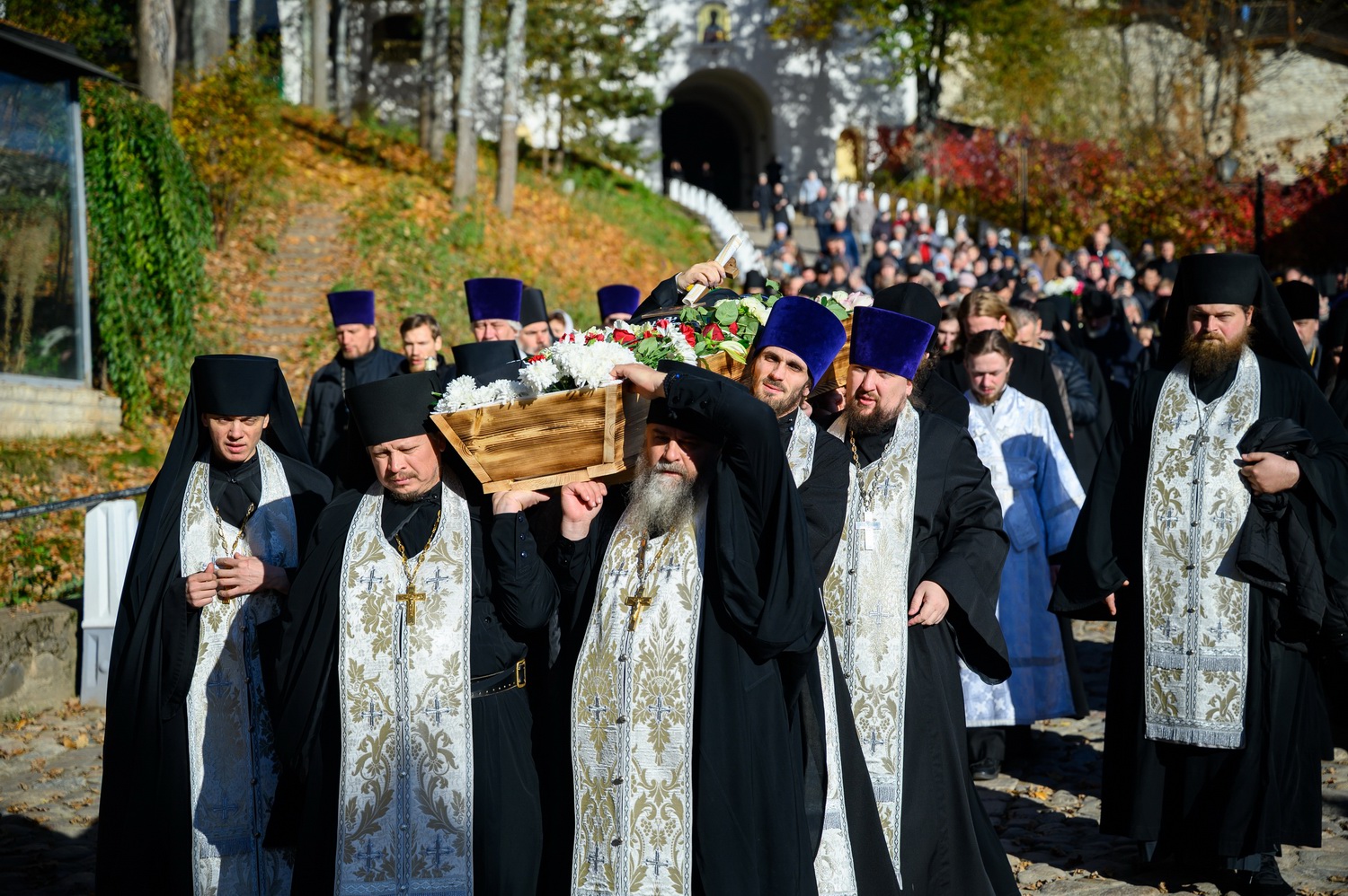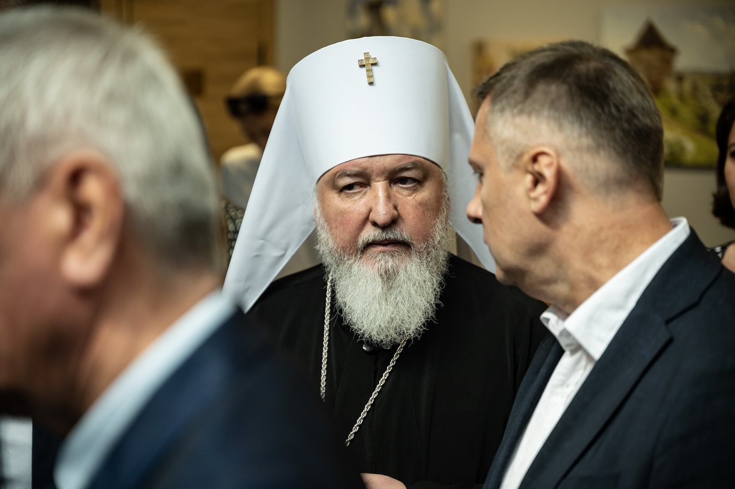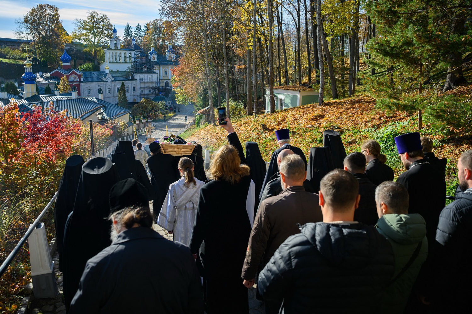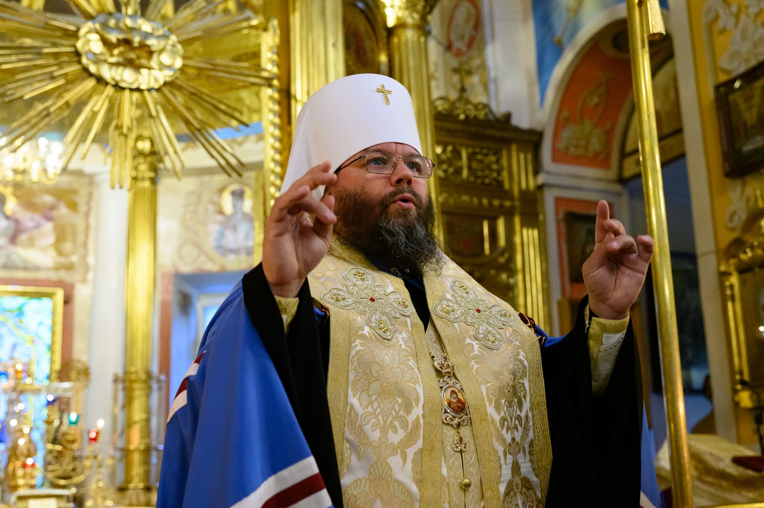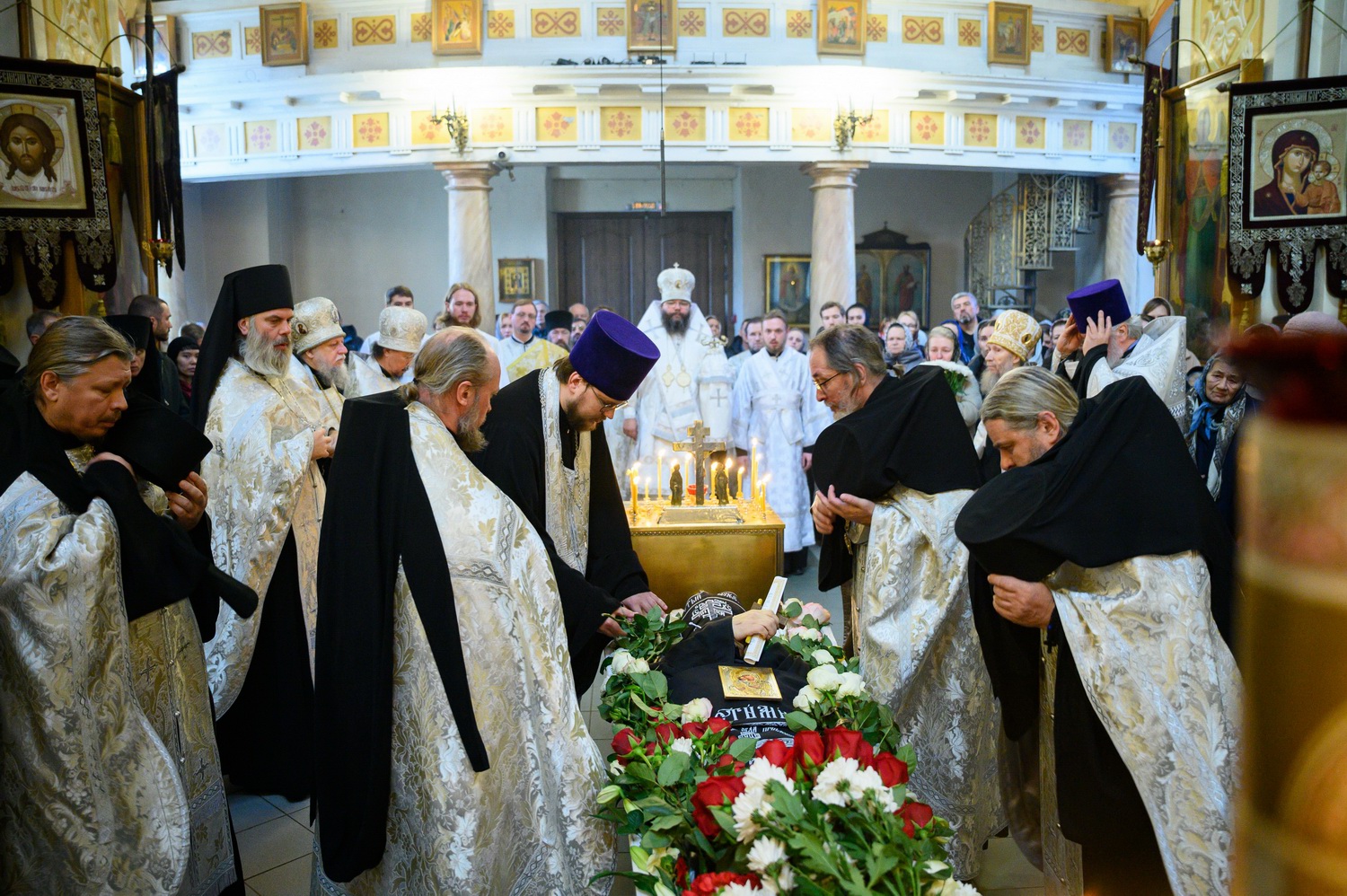 По окончании Литургии митрополит Псковский Матфей приветствовал Святейшего Патриарха Кирилла и преподнес Его Святейшеству икону Успения Пресвятой Богородицы.