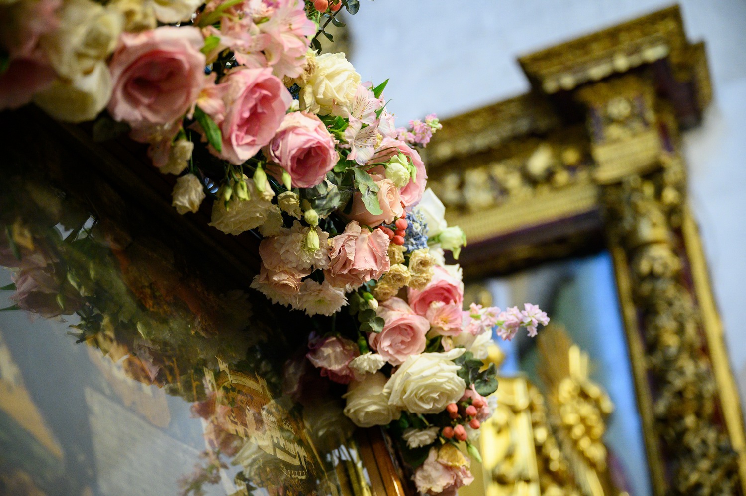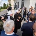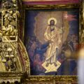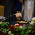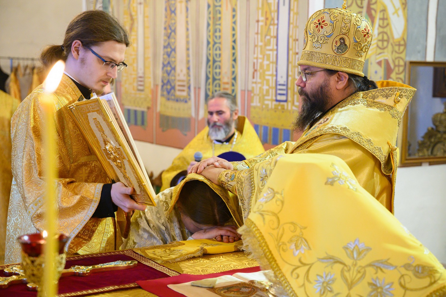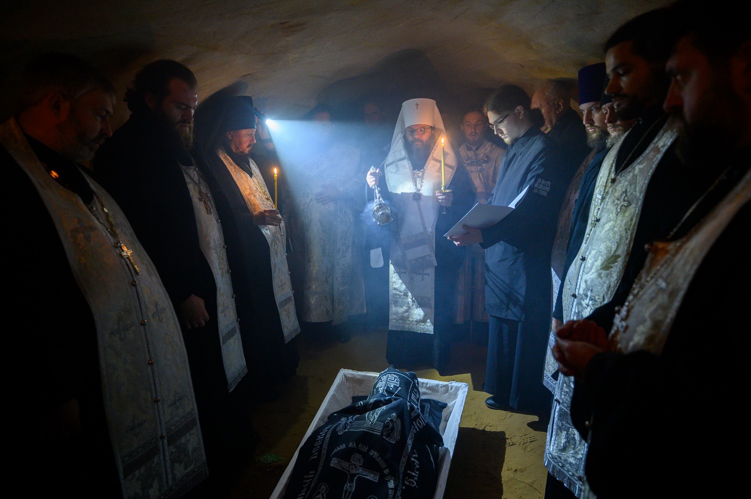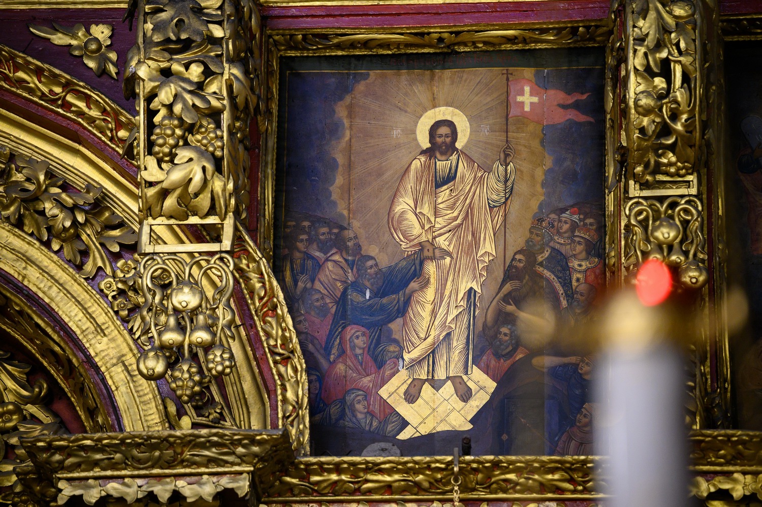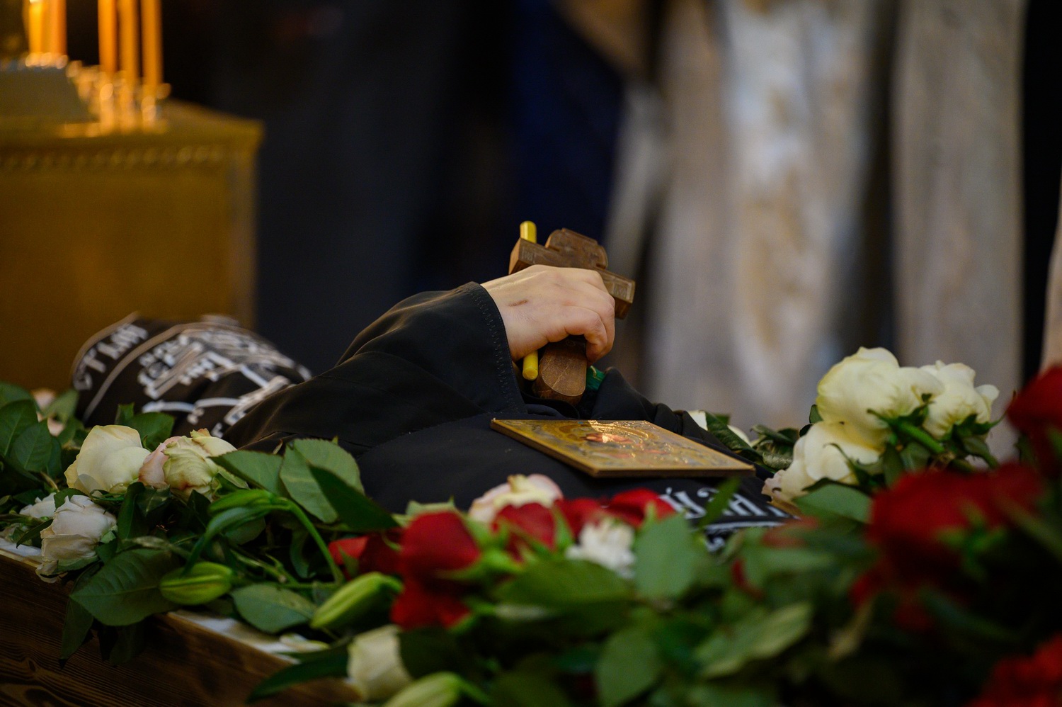 По окончании Литургии митрополит Псковский Матфей приветствовал Святейшего Патриарха Кирилла и преподнес Его Святейшеству икону Успения Пресвятой Богородицы.