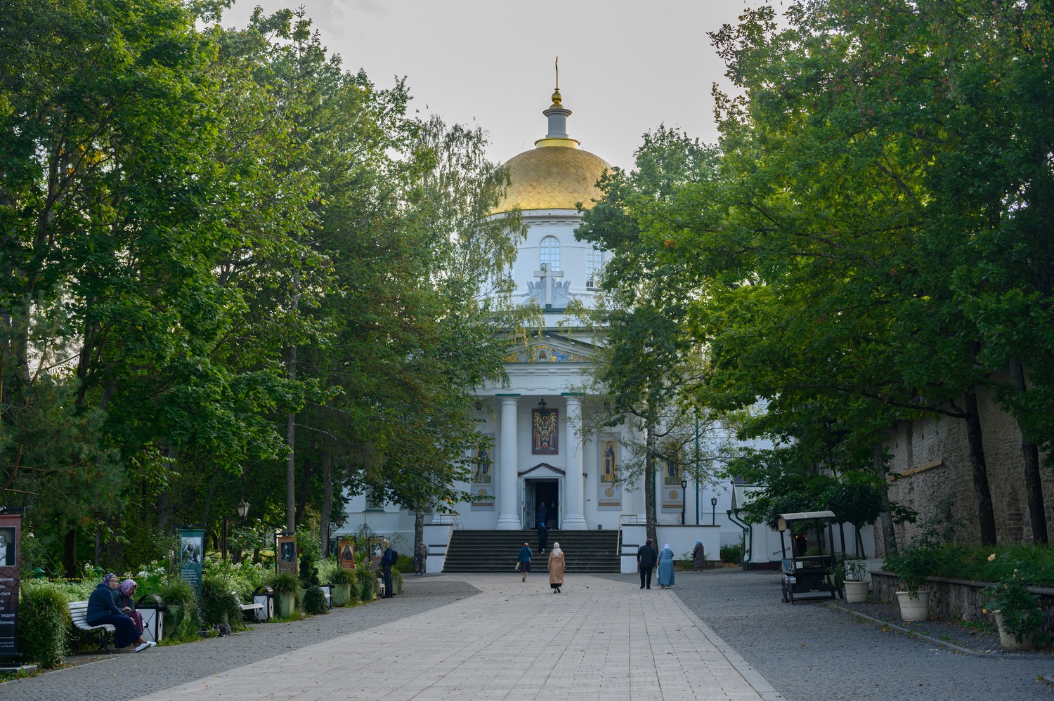 Верхний храм — в честь Успения Пресвятой Богородицы. Он обладает дополнительным верхним естественным освещением через центральный барабан. Доступ в храм осуществляется через лестницы, находящиеся в притворах и являющиеся эвакуационными. В северном притворе имеется лифт. В интерьерах использованы мрамор двенадцати оттенков и уникальные мозаики. Стены и своды алтаря храма выложены мозаикой. Мозаичный образ Христа Спасителя украшает и западную стену главного придела. Авторами и исполнителями мозаичных композиций выступают мастера художественно-производственного предприятия Лаврентьевых «Домострой». Полы Успенского храма выложены из иранского мрамора 12 цветов.
