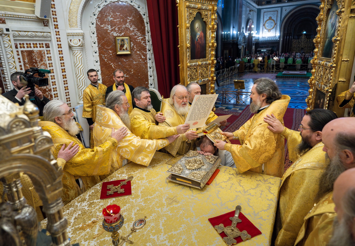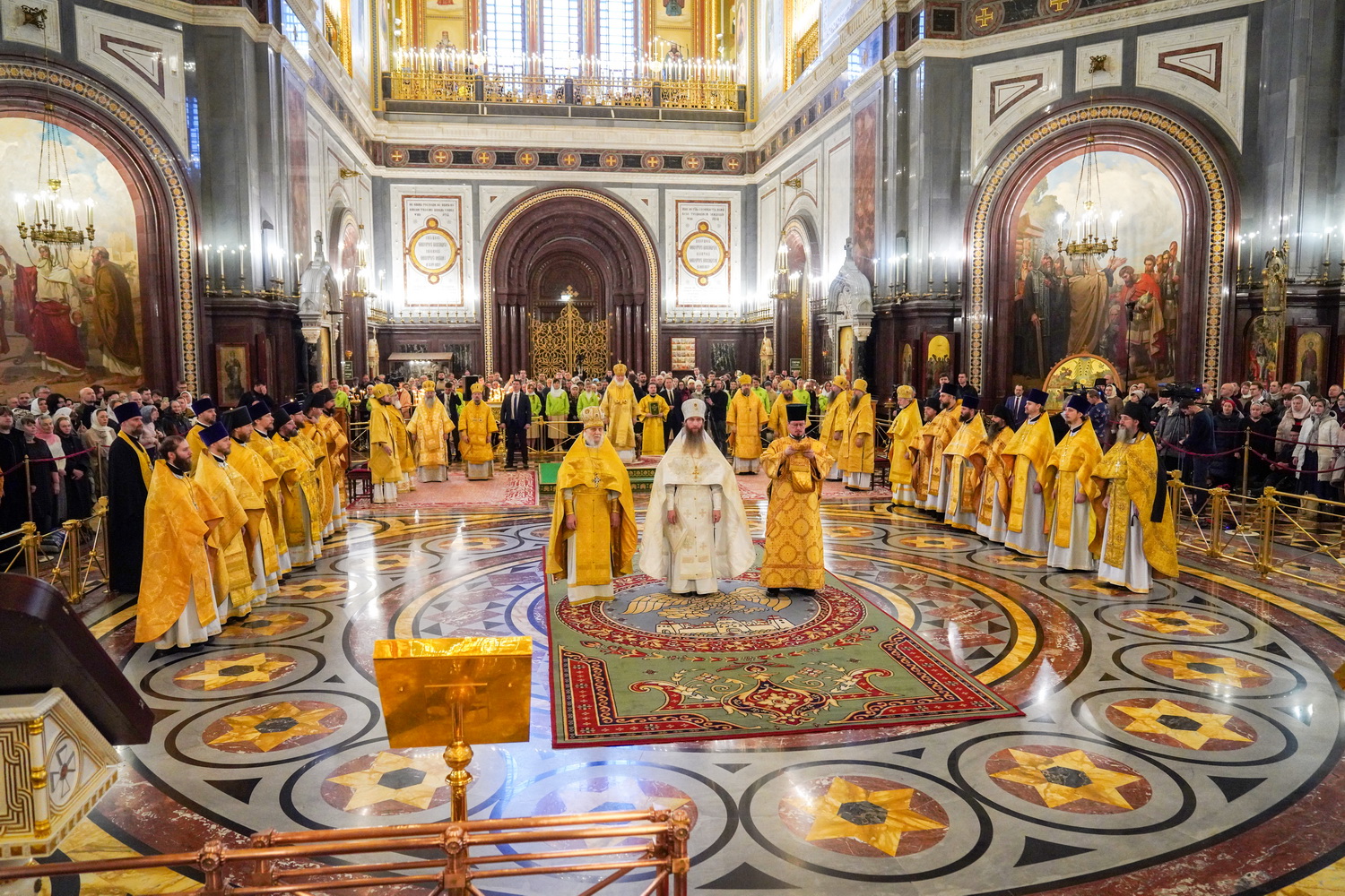 За Литургией Его Святейшеству сослужили: митрополит Минский и Заславский Вениамин, Патриарший экзарх всея Беларуси; митрополит Воскресенский Григорий, управляющий делами Московской Патриархии; митрополит Казанский и Татарстанский Кирилл; митрополит Псковский и Порховский Матфей; епископ Тихвинский и Лодейнопольский Мстислав; епископ Сергиево-Посадский Кирилл, наместник Свято-Троицкой Сергиевой лавры, ректор Московской духовной академии; епископ Раменский Алексий, личный секретарь Святейшего Патриарха Кирилла; епископ Егорьевский Мефодий, ректор Православного Свято-Тихоновского гуманитарного университета, наместник Николо-Угрешского ставропигиального мужского монастыря; протопресвитер Владимир Диваков, секретарь Патриарха Московского и всея Руси по г. Москве; протоиерей Михаил Рязанцев, ключарь Храма Христа Спасителя; протоиерей Андрей Марущак, клирик Храма Христа Спасителя; игумен Василий (Бурков), наместник Свято-Успенского Святогорского монастыря в Пушкинских горах (Псковская митрополия); игумен Феодорит (Золотарев), благочинный монастырей Гомельской епархии Белорусского экзархата; иеромонах Мисаил (Сарафанов), помощник управляющего делами Московской Патриархии; столичное духовенство; клирики ряда епархий Русской Православной Церкви.