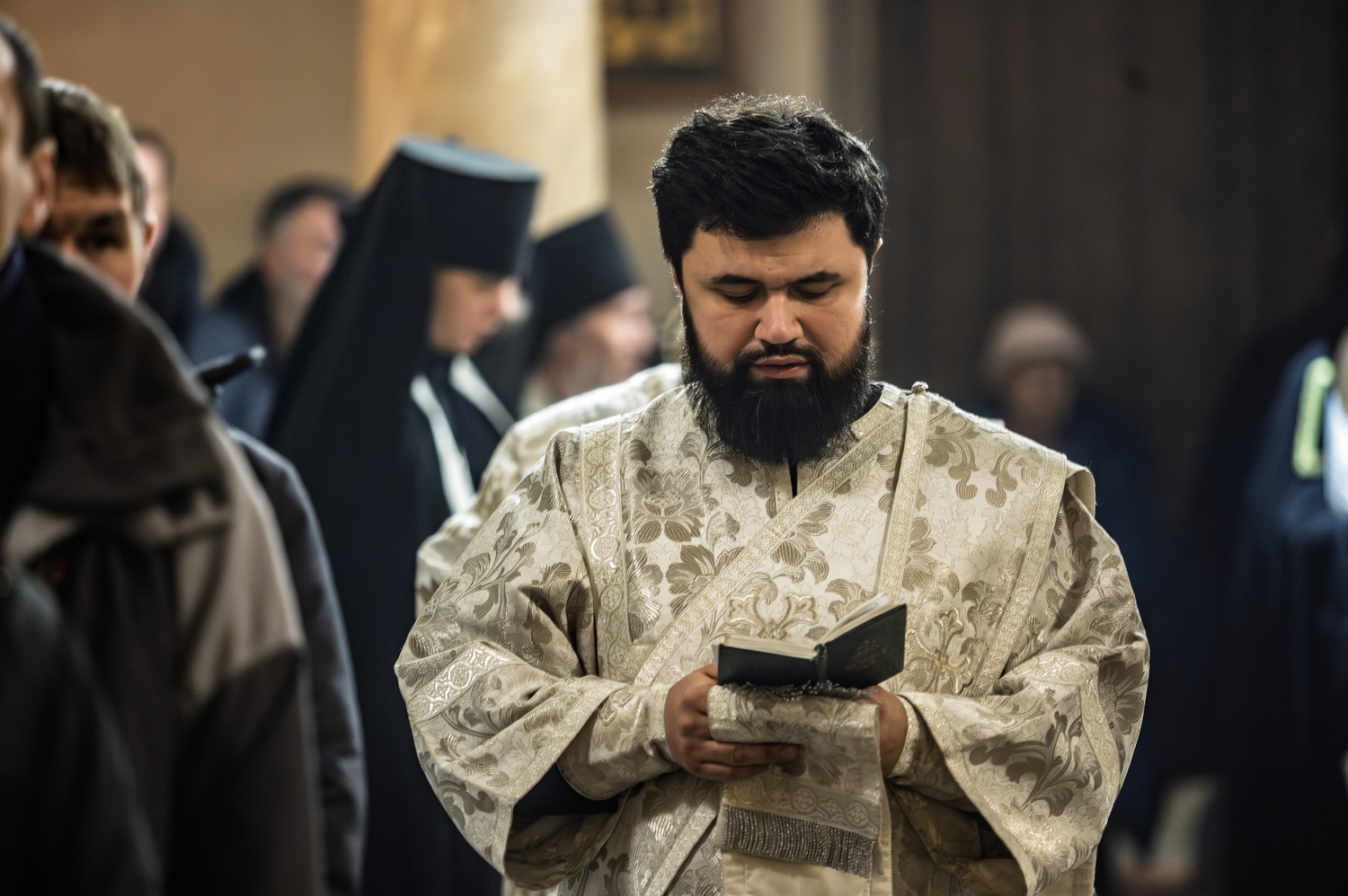 На малом входе Божественной Литургии митрополит Матфей удостоил насельника Свято-Успенского Псково-Печерского монастыря иеродиакона Симеона (Кивайло) права ношения двойного ораря.