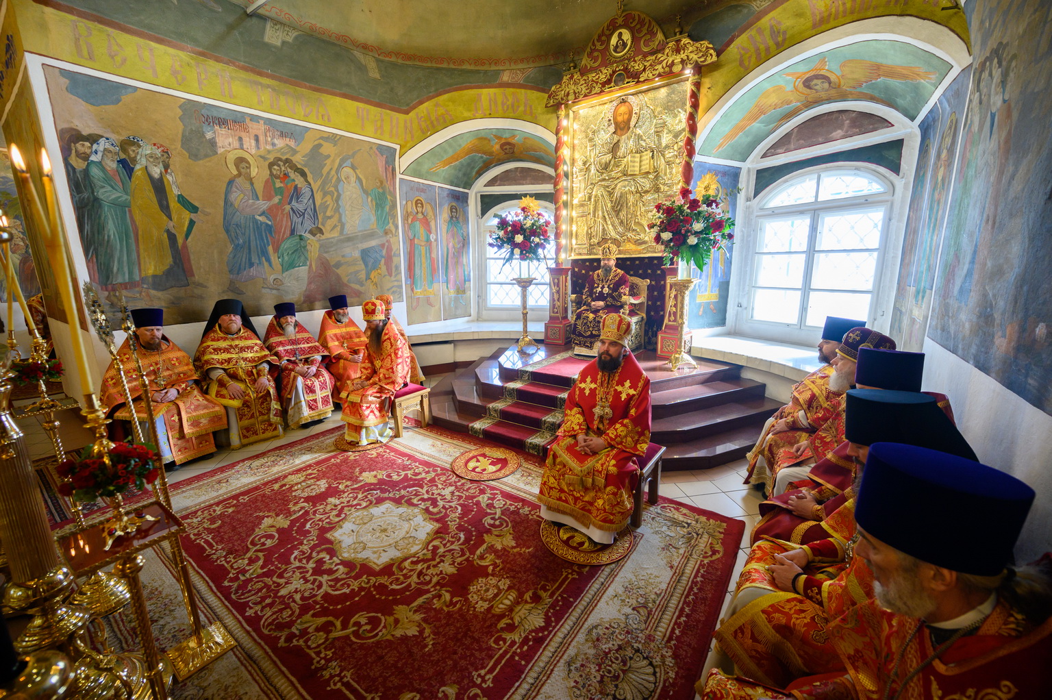 Его Высокопреосвященству сослужили: викарий Святейшего Патриарха Московского и всея Руси митрополит Звенигородский Арсений, епископ Великолукский и Невельский Варнава и многочисленное духовенство Псковской митрополии. Песнопения Литургии исполнил Архиерейский хор под управлением Марии Быковой. За богослужением молились: митрополит Евсевий (Саввин), братия мужских монастырей, настоятельницы женских обителей с сестрами, прихожане храмов епархии и гости праздника.