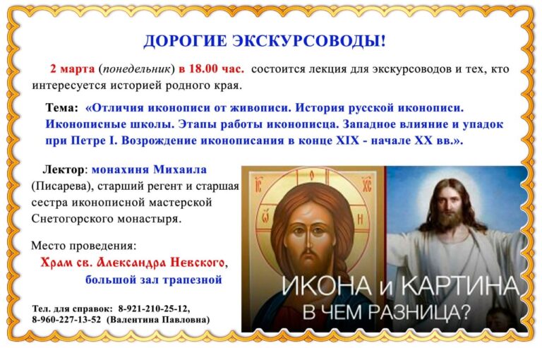 2 марта 2026 года в 18:00 в большом зале трапезной храма святого благоверного великого князя Александра Невского города Пскова состоится открытая лекция «Отличия иконописи от
